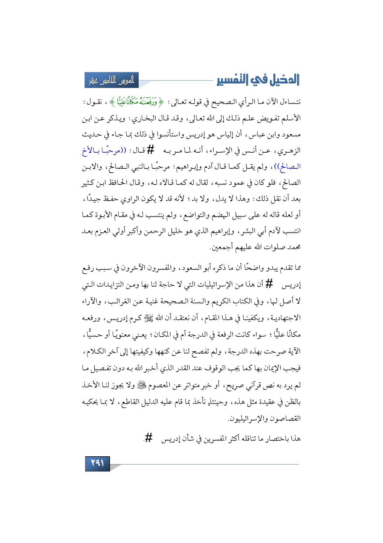 نتساءل الآن ما الرأي الصحيح في قوله تعالى: {وَرَفَعْنَاهُ مَكَانًا عَلِيًّا}، نقول: الأسلم تفويض علم ذلك إلى الله تعالى، وقد قال البخاري: ويذكر عن ابن مسعود وابن عباس، أن إلياس هو إدريس واستأنسوا في ذلك بما جاء في حديث الزهري، عن أنس في الإسراء، أنه لما مر به -عليه السلام- قال: ((مرحبًا بالأخ الصالح))، ولم يقل كما قال آدم وإبراهيم: مرحبًا بالنبي الصالح، والابن الصالح، فلو كان في عمود نسبه، لقال له كما قالاه له، وقال الحافظ ابن كثير بعد أن نقل ذلك: وهذا لا يدل، ولا بد؛ لأنه قد لا يكون الراوي حفظ جيدًا، أو لعله قاله له على سبيل الهضم والتواضع، ولم ينتسب له في مقام الأبوة كما انتسب لآدم أبي البشر، وإبراهيم الذي هو خليل الرحمن وأكبر أولي العزم بعد محمد صلوات الله عليهم أجمعين.