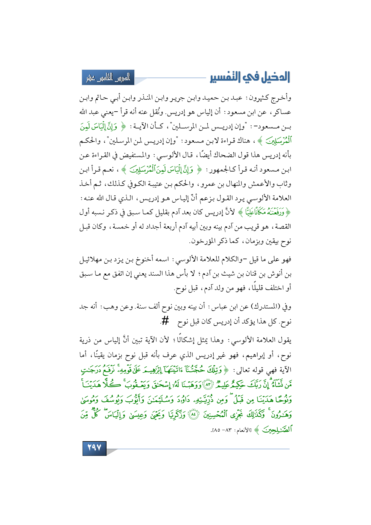 وأخرج كثيرون: عبد بن حميد وابن جرير وابن المنذر وابن أبي حاتم وابن عساكر، عن ابن مسعود: أن إلياس هو إدريس. ونُقل عنه أنه قرأ -يعني عبد الله بن مسعود-: "وإن إدريس لمن المرسلين"، كأن الآية: {وَإِنَّ إِلْيَاسَ لَمِنْ الْمُرْسَلِين}، هناك قراءة لابن مسعود: "وإن إدريس لمن المرسلين"، والحكم بأنه إدريس هذا قول الضحاك أيضًا، قال ال ألوسي: والمستفيض في القراءة عن ابن مسعود أنه قرأ كالجمهور: {وَإِنَّ إِلْيَاسَ لَمِنْ الْمُرْسَلِين}، نعم قرأ ابن وثاب والأعمش والمنهال بن عمرو، والحكم بن عتيبة الكوفي كذلك، ثم أخذ العلامة الألوسي يرد القول بزعم أنّ إلياس هو إدريس، الذي قال الله عنه: {وَرَفَعْنَاهُ مَكَانًا عَلِيًّا} لأنَّ إدريس كان بعد آدم بقليل كما سبق في ذكر نسبه أول القصة، هو قريب من آدم بينه وبين أبيه آدم أربعة أجداد له أو خمسة، وكان قبل نوح بيقين وبزمان، كما ذكر المؤرخون.