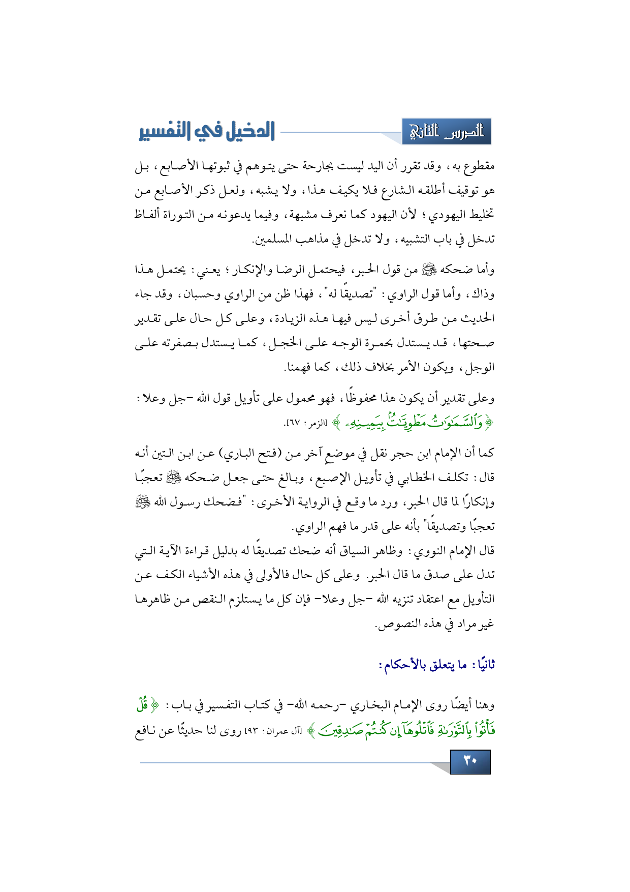 كما أن الإمام ابن حجر نقل في موضعٍ آخر من (فتح الباري) عن ابن التين أنه قال: تكلف الخطابي في تأويل الإصبع، وبالغ حتى جعل ضحكه -صلى الله عليه وسلم- تعجبًا وإنكارًا لما قال الحبر، ورد ما وقع في الرواية الأخرى: "فضحك رسول الله -صلى الله عليه وسلم- تعجبًا وتصديقًا" بأنه على قدر ما فهم الراوي.