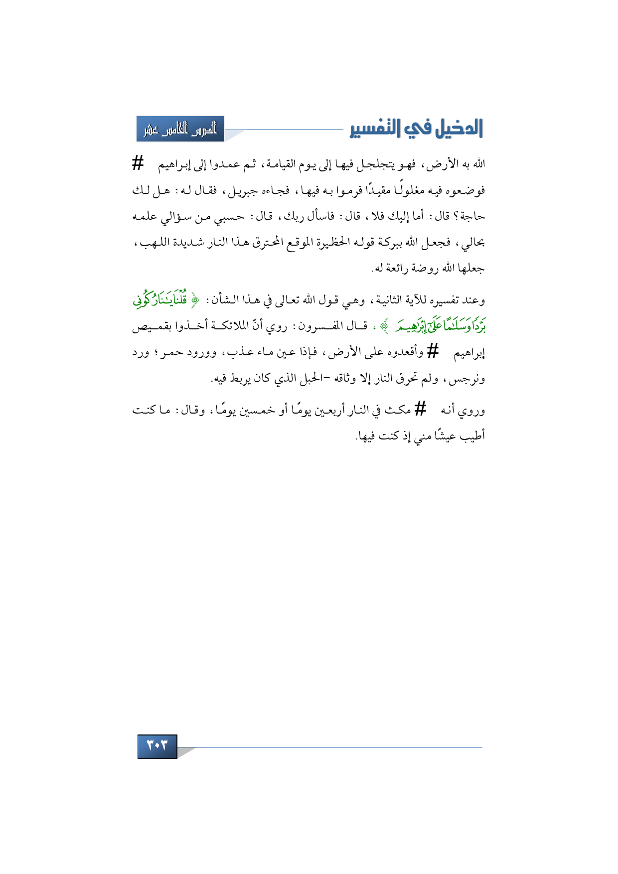 وعند تفسيره للآية الثانية، وهي قول الله تعالى في هذا الشأن: {قُلْنَا يَا نَارُ كُونِي بَرْدًا وَسَلاَمًا عَلَى إِبْرَاهِيم}، قال المفسرون: روي أنّ الملائكة أخذوا بقميص إبراهيم -عليه السلام- وأقعدوه على الأرض، فإذا عين ماء عذب، وورود حمر؛ ورد ونرجس، ولم تحرق النار إلا وثاقه -الحبل الذي كان يربط فيه.