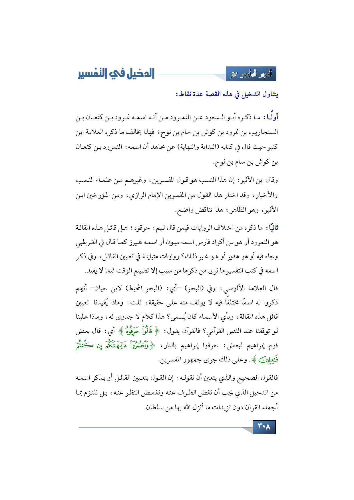 ثانيًا: ما ذكره من اختلاف الروايات فيمن قال لهم: حرقوه؛ هل قائل هذه المقالة هو النمرود أو هو من أكراد فارس اسمه ميون أو اسمه هيرز كما قال في القرطبي وجاء فيه أو هو هدير أو هو غير ذلك؟ روايات متباينة في تعيين القائل، وفي ذكر اسمه في كتب التفسير ما نرى من ذكرها من سبب إلا تضييع الوقت فيما لا يفيد.