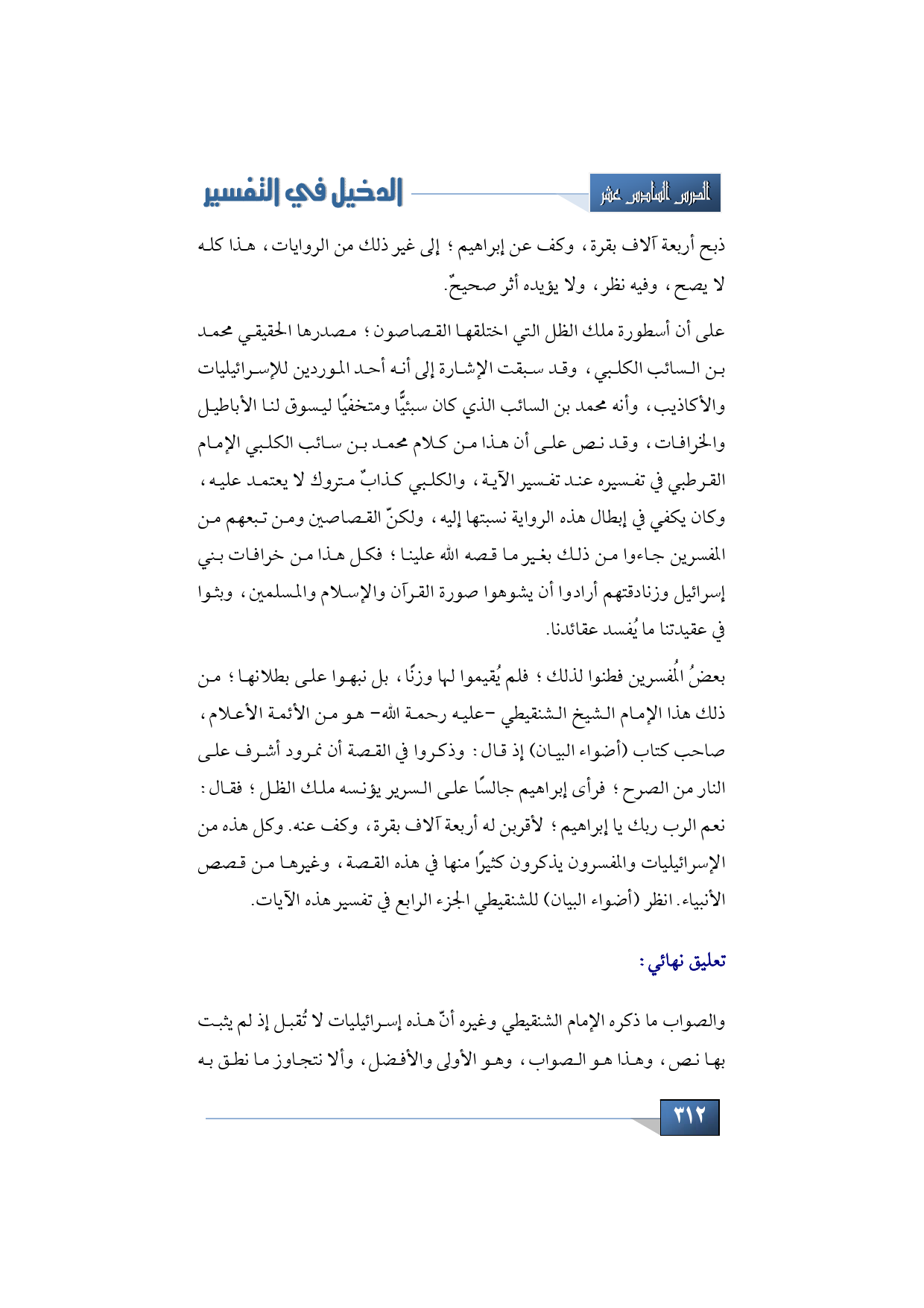 بعضُ المُفسرين فطنوا لذلك؛ فلم يُقيموا لها وزنًا، بل نبهوا على بطلانها؛ من ذلك هذا الإمام الشيخ الشنقيطي -عليه رحمة الله- هو من الأئمة الأعلام، صاحب كتاب (أضواء البيان) إذ قال: وذكروا في القصة أن نمرود أشرف على النار من الصرح؛ فرأى إبراهيم جالسًا على السرير يؤنسه ملك الظل؛ فقال: نعم الرب ربك يا إبراهيم؛ لأقربن له أربعة آلاف بقرة، وكف عنه. وكل هذه من الإسرائيليات والمفسرون يذكرون كثيرًا منها في هذه القصة، وغيرها من قصص الأنبياء. انظر (أضواء البيان) للشنقيطي الجزء الرابع في تفسير هذه الآيات.