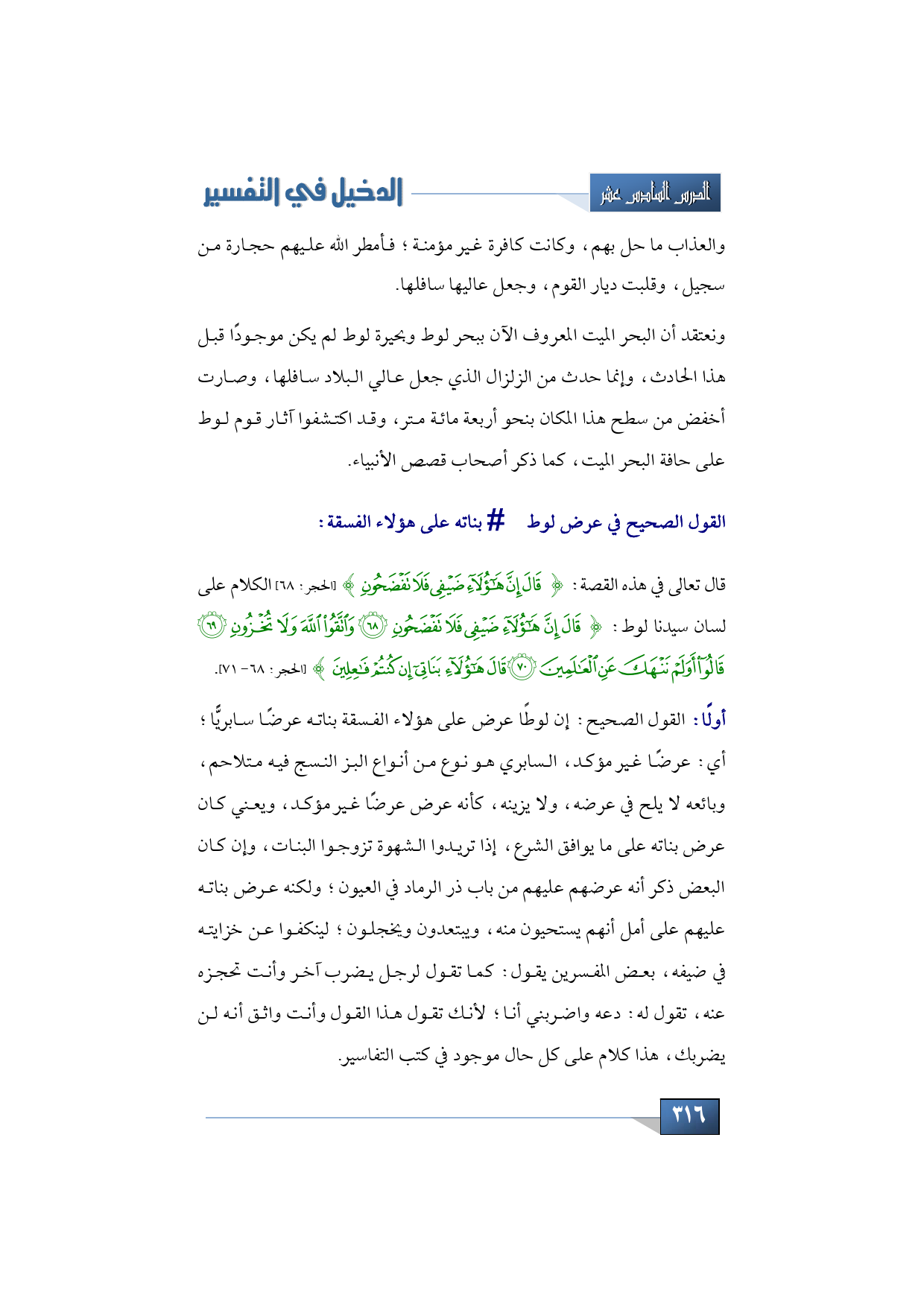 القول الصحيح: إن لوطًا عرض على هؤلاء الفسقة بناته عرضًا سابريًّا؛ أي: عرضًا غير مؤكد، السابري هو نوع من أنواع الب ز النسج فيه متلاحم، وبائعه لا يلح في عرضه، ولا يزينه، كأنه عرض عرضًا غير مؤكد، ويعني كان عرض بناته على ما يوافق الشرع، إذا تريدوا الشهوة تزوجوا البنات، وإن كان البعض ذكر أنه عرضهم عليهم من باب ذر الرماد في العيون؛ ولكنه عرض بناته عليهم على أمل أنهم يستحيون منه، ويبتعدون ويخجلون؛ لينكفوا عن خزايته في ضيفه، بعض المفسرين يقول: كما تقول لرجل يضرب آخر وأنت تحجزه عنه، تقول له: دعه واضربني أنا؛ لأنك تقول هذا القول وأنت واثق أنه لن يضربك، هذا كلام على كل حال موجود في كتب التفاسير.
