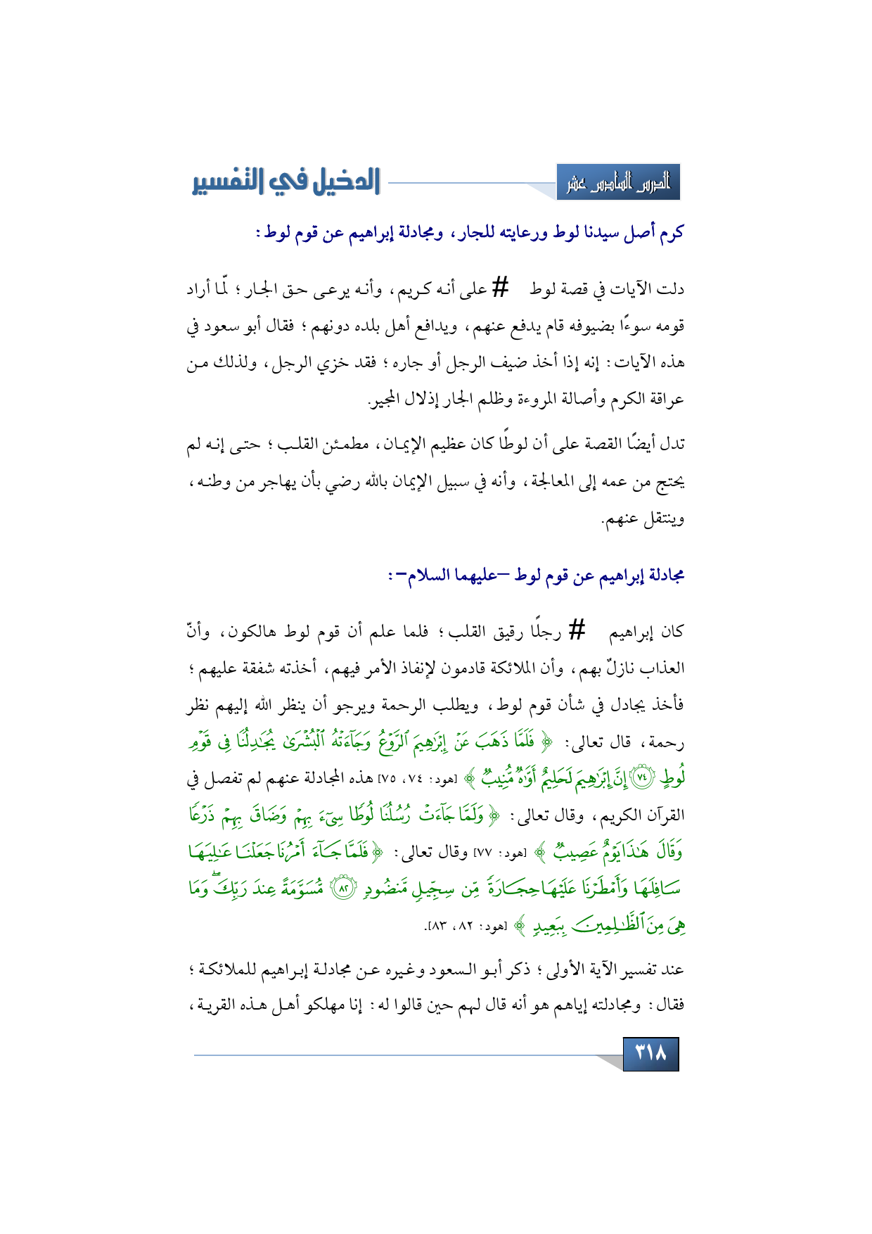 نعود فنبين كرم أصل سيدنا لوط ور عايته للجار، ومجادلة إبراهيم عن قوم لوط:
