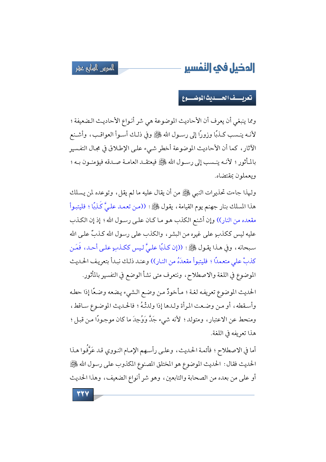 ولهذا جاءت تحذيرات النبي -عليه الصلاة والسلام- من أن يقال عليه ما لم يقل، وتوعده لمن يسلك هذا المسلك بنار جهنم يوم القيامة، يقول -عليه الصلاة والسلام-: ((من تعمد عليَّ كَذِبًا؛ فليتبوأ مقعده من النار)) وإن أشنع الكذب هو ما كان على رسول الله؛ إذ إن الكذب عليه ليس ككذبٍ على غيره من البشر، والكذب على رسول الله كذبٌ على الله سبحانه، وفي هذا يقول -عليه الصلاة والسلام-: ((إن كذبًا علي َّ ليس ككذبٍ على أحد، فَمَن كذبْ علي متعمدًا؛ فليتبوأ مقعدَهُ من النار)) وعند ذلك نبدأ بتعريف الحديث الموضوع في اللغة والاصطلاح، ونتعرف متى نشأ الوضع في التفسير بالمأثور.