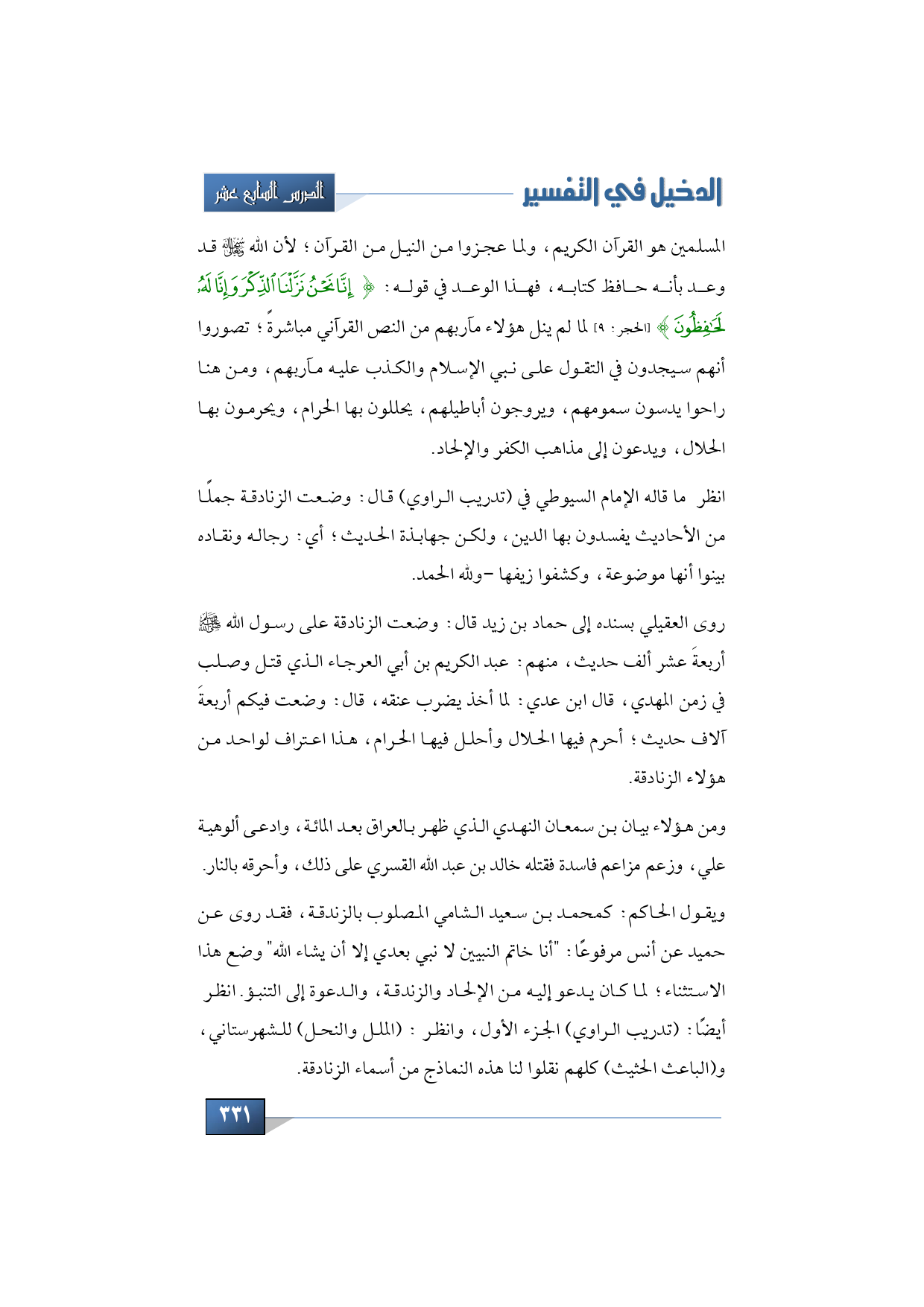 المسلمين هو القرآن الكريم، ولما عجزوا من النيل من القرآن؛ لأن الله سبحانه وتعالى قد وعد بأنه حافظ كتابه، فهذا الوعد في قوله: {إِنَّا نَحْنُ نَزَّلْنَا الذِّكْرَ وَإِنَّا لَهُ لَحَافِظُون} (الحجر: 9) لما لم ينل هؤلاء مآربهم من النص القرآني مباشرةً؛ تصوروا أنهم سيجدون في التقول على نبي الإسلام والكذب عليه مآربهم، ومن هنا راحوا يدسون سمومهم، ويروجون أباطيلهم، يحللون بها الحرام، ويحرمون بها الحلال، ويدعون إلى مذاهب الكفر والإلحاد.