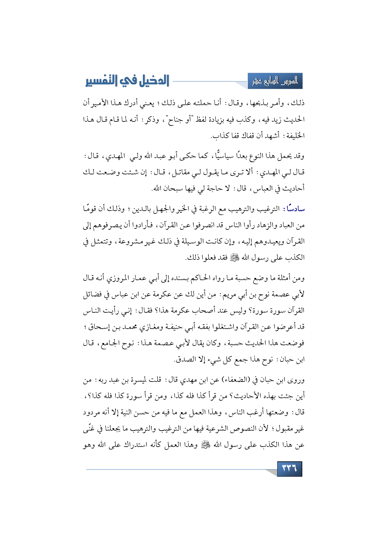 سادسًا: من الأسباب أيضًا التي روجت للأحاديث الموضوعة الترغيب والترهيب مع الرغبة في الخير والجهل بالدين؛ وذلك أن قومًا من العباد والزهاد رأوا الناس قد انصرفوا عن القرآن، فأرادوا أن يصرفوهم إلى القرآن ويعيدوهم إليه، وإن كانت الوسيلة في ذلك غير مشروعة، وتتمثل في الكذب على رسول الله -صلى الله عليه وسلم- فقد فعلوا ذلك.