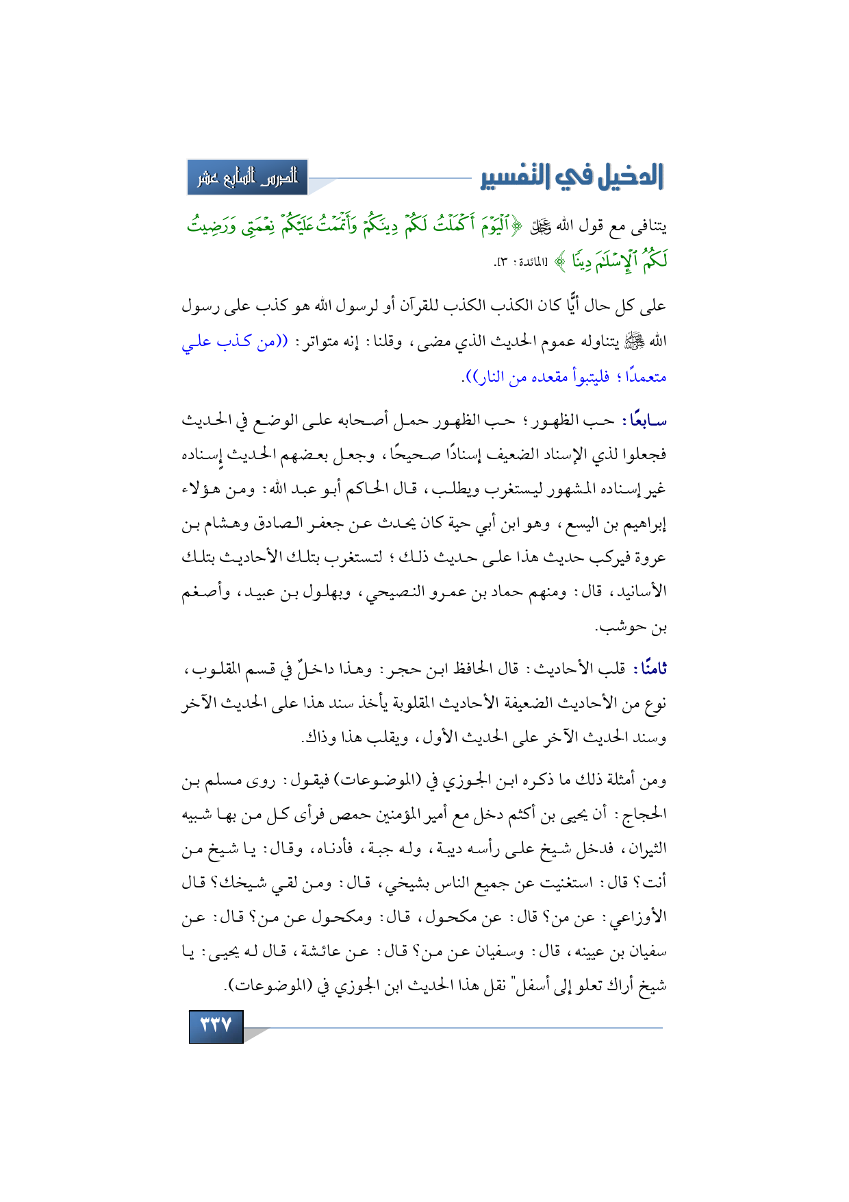 على كل حال أيًّا كان الكذب الكذب للقرآن أو لرسول الله هو كذب على رسول الله -صلى الله عليه وسلم- يتناوله عموم الحديث الذي مضى، وقلنا: إنه متواتر: ((من كذب علي متعمدًا؛ فليتبوأ مقعده من النار)).