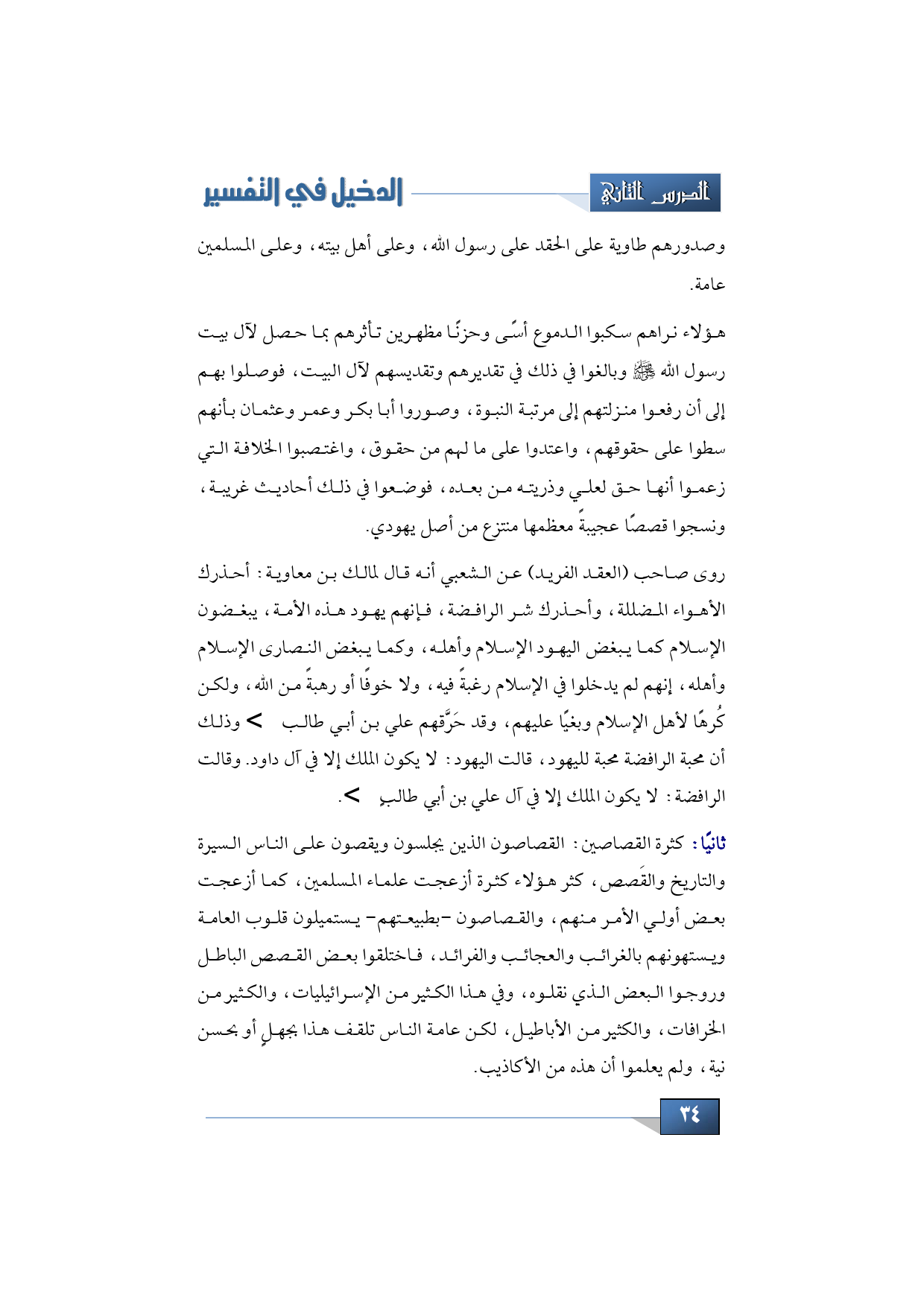 روى صاحب (العقد الفريد) عن الشعبي أنه قال لمالك بن معاوية: أحذرك الأهواء المضللة، وأحذرك شر الرافضة، فإنهم يهود هذه الأمة، يبغضون الإسلام كما يبغض اليهود الإسلام وأهله، وكما يبغض النصارى الإسلام وأهله، إنهم لم يدخلوا في الإسلام رغبةً فيه، ولا خوفًا أو رهبةً من الله، ولكن كُرهًا لأهل الإسلام وبغيًا عليهم، وقد حَرَّقهم علي بن أبي طالب -رضي الله عنه- وذلك أن محبة الرافضة محبة لليهود، قالت اليهود: لا يكون الملك إلا في آل داود. وقالت الرافضة: لا يكون الملك إلا في آل علي بن أبي طالبٍ -رضي الله عنه.