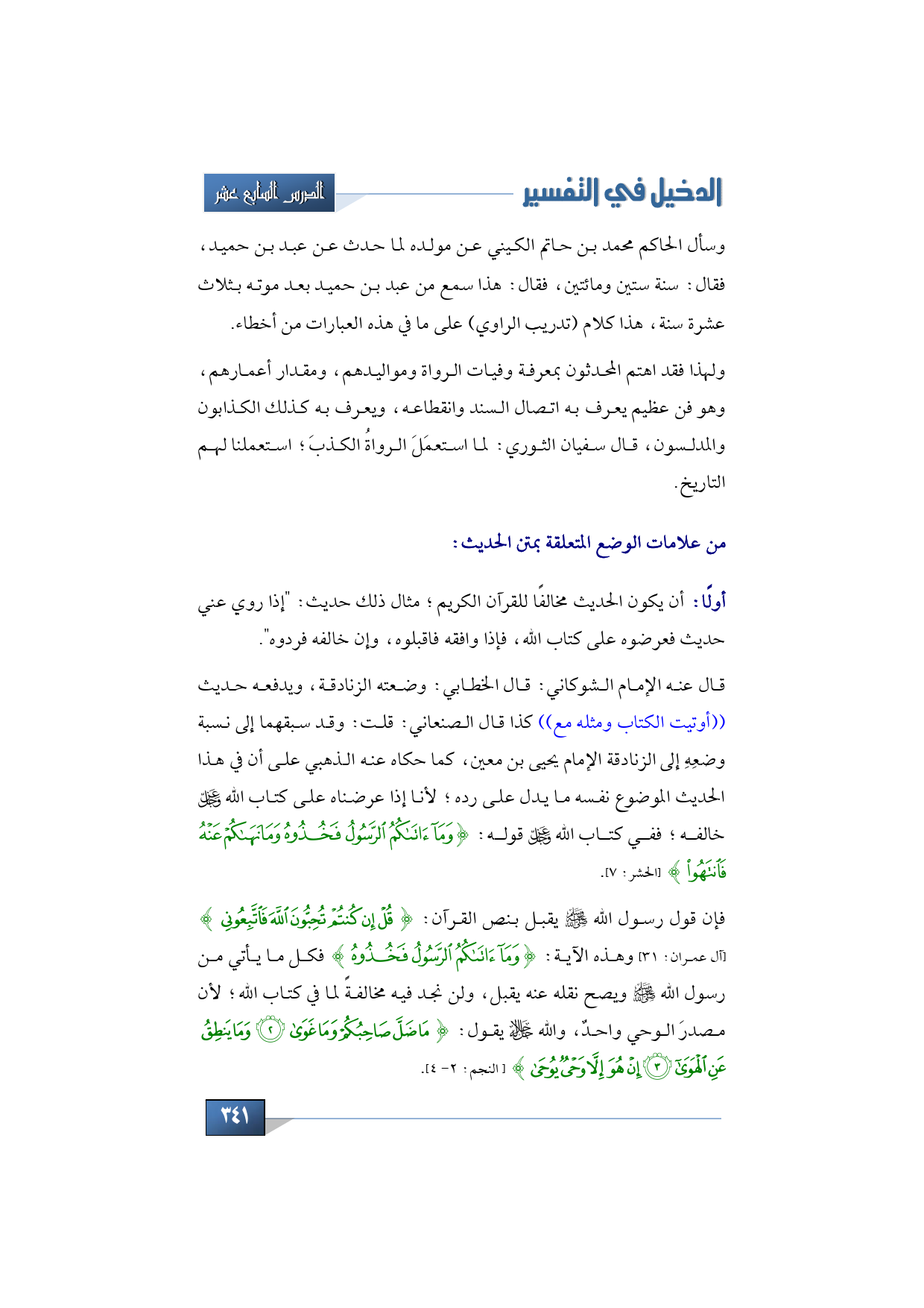 ننتقل إلى علامات الوضع المتعلقة بمتن الحديث؛ أي: إلى الكلام نفسه؛ فمن علامات الوضع التي ترجع إلى الكلام نفسه: أن يكون الحديث مخالفًا للقرآن الكريم؛ مثال ذلك حديث: "إذا روي عني حديث فعرضوه على كتاب الله، فإذا وافقه فاقبلوه، وإن خالفه فردوه".