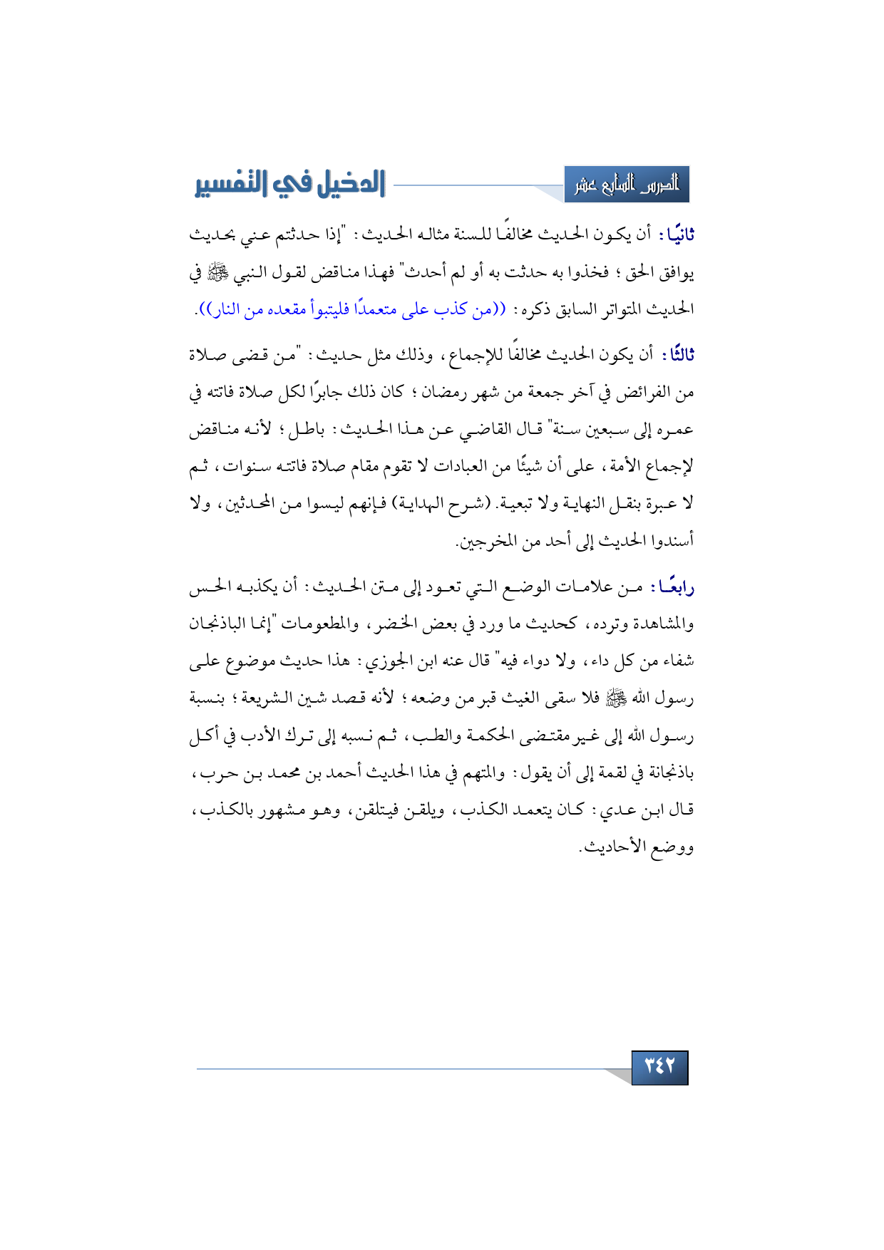 رابعًا: من علامات الوضع التي تعود إلى متن الحديث: أن يكذبه الحس والمشاهدة وترده، كحديث ما ورد في بعض الخضر، والمطعومات "إنما الباذنجان شفاء من كل داء، ولا دواء فيه" قال عنه ابن الجوزي: هذا حديث موضوع على رسول الله -صلى الله عليه وسلم- فلا سقى الغيث قبر من وضعه؛ لأنه قصد شين الشريعة؛ بنسبة رسول الله إلى غير مقتضى الحكمة والطب، ثم نسبه إلى ترك الأدب في أكل باذنجانة في لقمة إلى أن يقول: والمتهم في هذا الحديث أحمد بن محمد بن حرب، قال ابن عدي: كان يتعمد الكذب، ويلقن فيتلقن، وهو مشهور بالكذب، ووضع الأحاديث.
