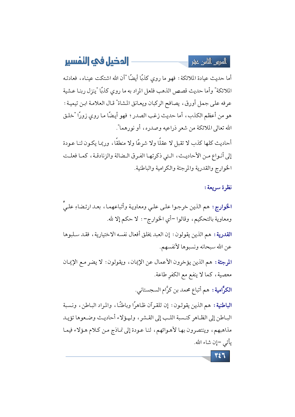 أما حديث عيادة الملائكة: فهو ما روي كذبًا أيضًا "أن الله اشتكت عيناه، فعادته الملائكة" وأما حديث قصص الذهب فلعل المراد به ما روي كذبًا "ينزل ربنا عشية عرفه على جمل أورق، يصافح الركبان ويعانق المشاة" قال العلامة ابن تيمية: هو من أعظم الكذب، أما حديث زغب الصدر؛ فهو أيضًا ما روي زورًا "خلق الله تعالى الملائكة من شعر ذراعيه وصدره، أو نورهما".