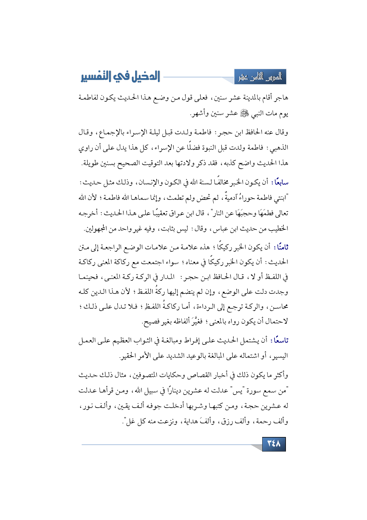 سابعًا: من علامات الوضع في الحديث: أن يكون الخبر مخالفًا لسنة الله في الكون والإنسان، وذلك مثل حديث: "ابنتي فاطمة حوراءُ آدميةٌ، لم تحض ولم تطمث، وإنما سماها الله فاطمة؛ لأن الله تعالى فطمَهَا وحجبَهَا عن النار"، قال ابن عراق تعقيبًا على هذا الحديث: أخرجه الخطيب من حديث ابن عباس، وقال: ليس بثابت، وفيه غير واحد من المجهولين.