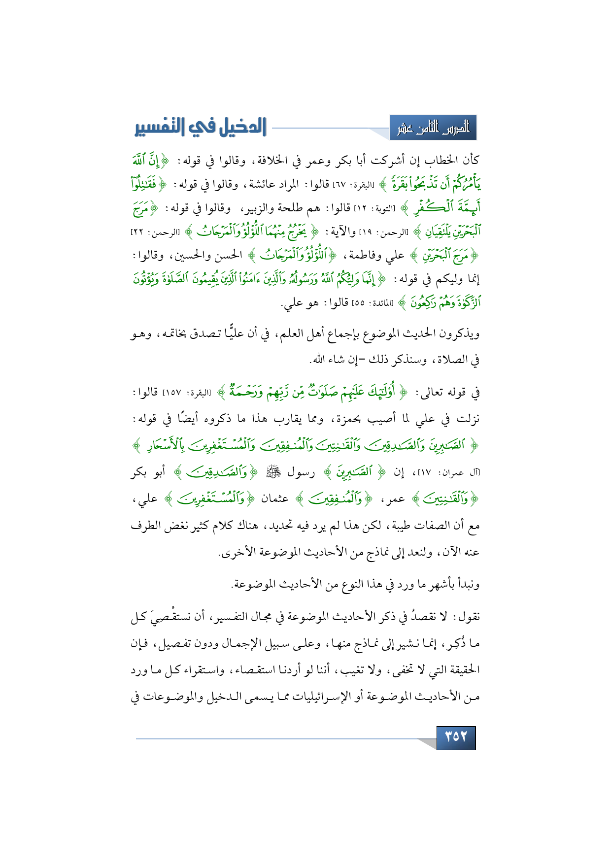 في قوله تعالى: {أُولَئِكَ عَلَيْهِمْ صَلَوَاتٌ مِنْ رَبِّهِمْ وَرَحْمَةٌ} (البقرة: 157) قالوا: نزلت في علي لما أصيب بحمزة، ومما يقارب هذا ما ذكروه أيضًا في قوله: {الصَّابِرِينَ وَالصَّادِقِينَ وَالْقَانِتِينَ وَالْمُنْفِقِينَ وَالْمُسْتَغْفِرِينَ بِالْأَسْحَارِ} (آل عمران: 17)، إن {الصَّابِرِينَ} رسول -صلى الله عليه وسلم- {وَالصَّادِقِينَ} أبو بكر {وَالْقَانِتِينَ} عمر، {وَالْمُنْفِقِينَ} عثمان {وَالْمُسْتَغْفِرِينَ} علي، مع أن الصفات طيبة، لكن هذا لم يرد فيه تحديد، هناك كلام كثير نغض الطرف عنه الآن، ولنعد إلى نماذج من الأحاديث الموضوعة الأخرى.