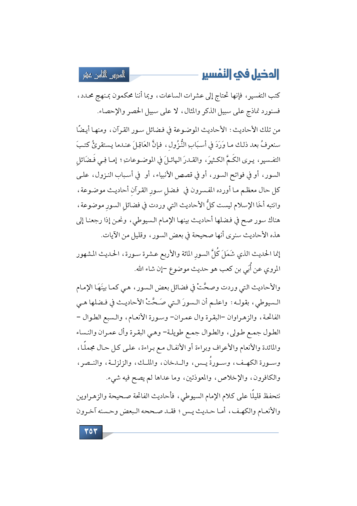 من تلك الأحاديث: الأحاديث الموضوعة في فضائل سور القرآن، ومنها أيضًا سنعرفُ بعد ذلك ما وَرَدَ في أسبَابِ النُّزُولِ، فإنَّ العَاقِلَ عندما يستقرئُ كتبَ التفسير، يرى الكَمَّ الكثيرَ، والقدرَ الهائلَ في الموضوعاتِ؛ إما فِي فَضَائلِ السور، أو في فواتح السور، أو في قصص الأنبياء، أو في أسباب النزول، على كل حال معظم ما أورده المفسرون في فضلِ سورِ القرآنِ أحاديث موضوعة، وانتبه أخَا الإسلام ليست كلُّ الأحاديث التي وردت في فضائلِ السورِ موضوعة، هناك سور صح في فضلها أحاديث بينها الإمام السيوطي، ونحن إذا رجعنا إلى هذه الأحاديث سنرى أنها صحيحة في بعض السور، وقليل من الآيات.