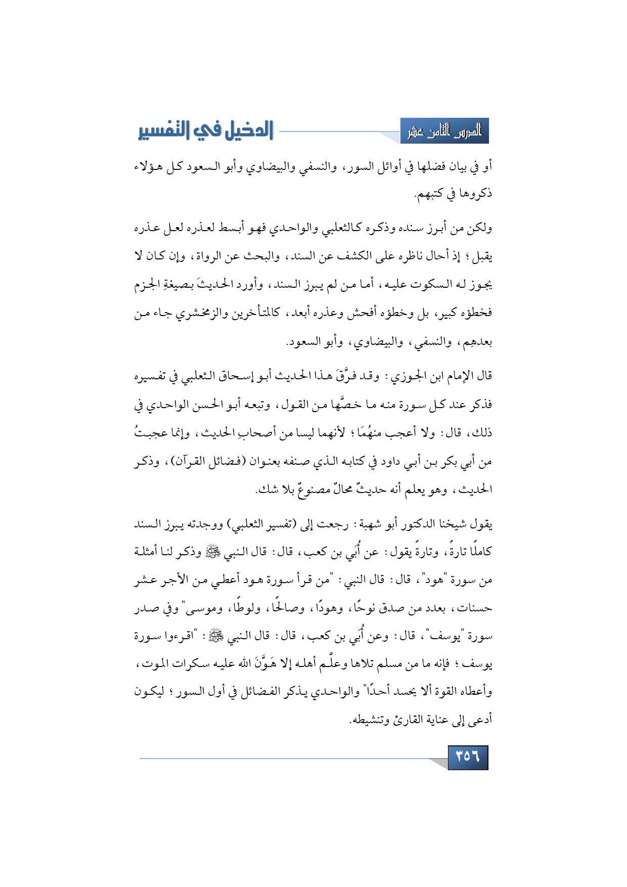 يقول شيخنا الدكتور أبو شهبة: رجعت إلى (تفسير الثعلبي) ووجدته يبرز السند كاملًا تارةً، وتارةً يقول: عن أُبَي بن كعب، قال: قال النبي -صلى الله عليه وسلم- وذكر لنا أمثلة من سورة " هود "، قال: قال النبي: "من قرأ سورة هود أعطي من الأجر عشر حسنات، بعدد من صدق نوحًا، وهودًا، وصالحًا، ولوطًا، وموسى" وفي صدر سورة " يوسف "، قال: وعن أُبَي بن كعب، قال: قال النبي -صلى الله عليه وسلم-: "اقرءوا سورة يوسف؛ فإنه ما من مسلم تلاها وعلَّم أهله إلا هَوَّنَ الله عليه سكرات الموت، وأعطاه القوة ألا يحسد أحدًا" والواحدي يذكر الفضائل في أول السور؛ ليكون أدعى إلى عناية القارئ وتنشيطه.