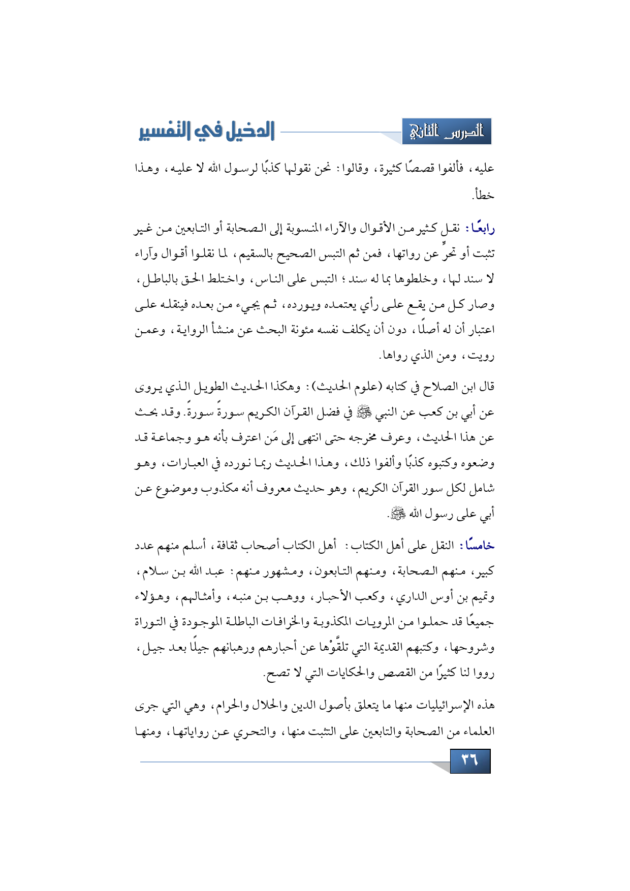 خامسًا: من الأسباب التي ساعدت على تفشي الإسرائيليات: النقل على أهل الكتاب، أهل الكتاب أصحاب ثقافة، أسلم منهم عدد كبير، منهم الصحابة، ومنهم التابعون، ومشهور منهم: عبد الله بن سلام، وتميم بن أوس الداري، وكعب الأحبار، ووهب بن منبه، وأمثالهم، وهؤلاء جميعًا قد حملوا من المرويات المكذوبة والخرافات الباطلة الموجودة في التوراة وشروحها، وكتبهم القديمة التي تلقَّوْها عن أحبارهم ورهبانهم جيلًا بعد جيل، رووا لنا كثيرًا من القصص والحكايات التي لا تصح.