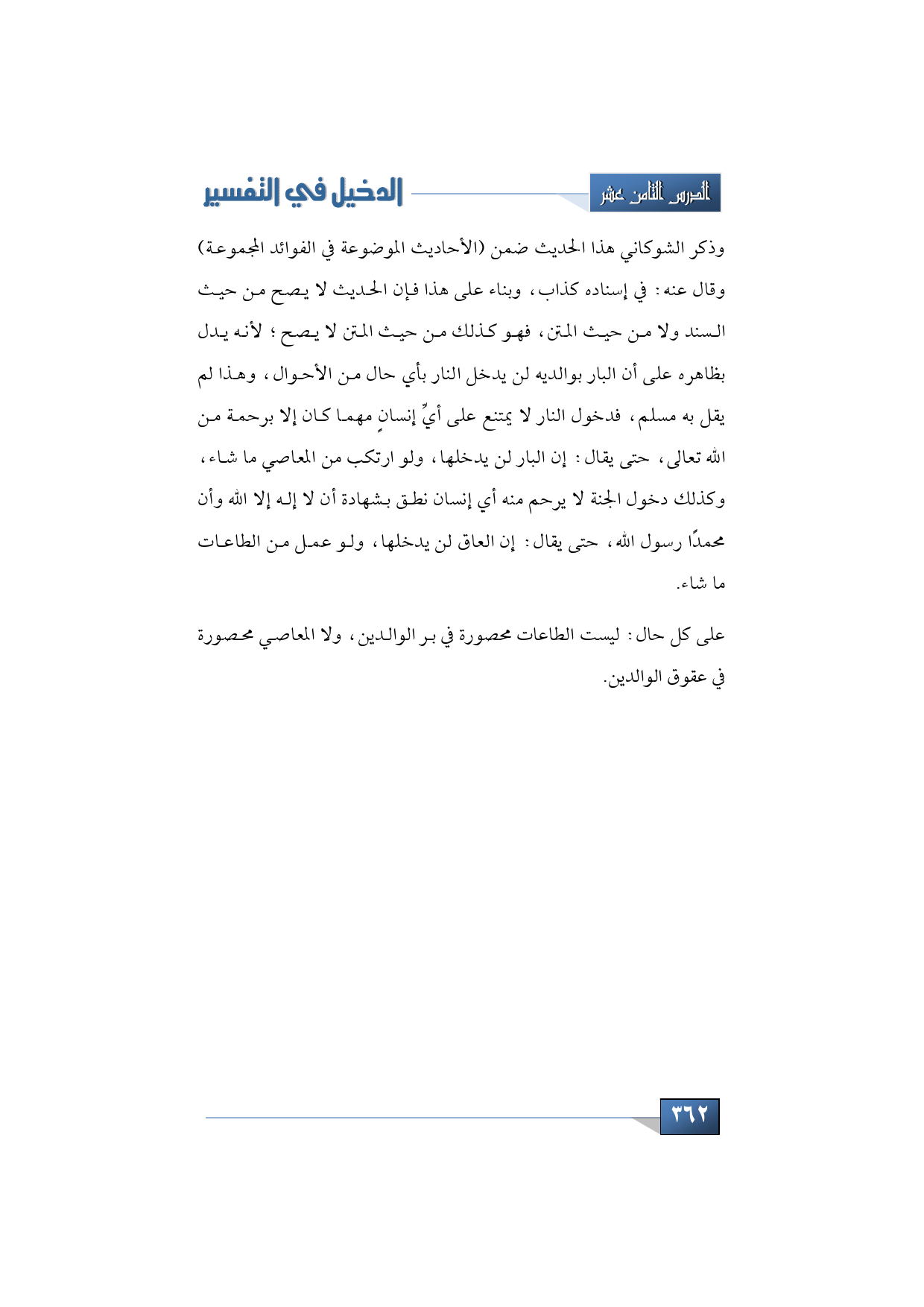 وذكر الشوكاني هذا الحديث ضمن (الأحاديث الموضوعة في الفوائد المجموعة) وقال عنه: في إسناده كذاب، وبناء على هذا فإن الحديث لا يصح من حيث السند ولا من حيث المتن، فهو كذلك من حيث المتن لا يصح؛ لأنه يدل بظاهره على أن البار بوالديه لن يدخل النار بأي حال من الأحوال، وهذا لم يقل به مسلم، فدخول النار لا يمتنع على أيِّ إنسانٍ مهما كان إلا برحمة من الله تعالى، حتى يقال: إن البار لن يدخلها، ولو ارتكب من المعاصي ما شاء، وكذلك دخول الجنة لا يرحم منه أي إنسان نطق بشهادة أن لا إله إلا الله وأن محمدًا رسول الله، حتى يقال: إن العاق لن يدخلها، ولو عمل من الطاعات ما شاء.