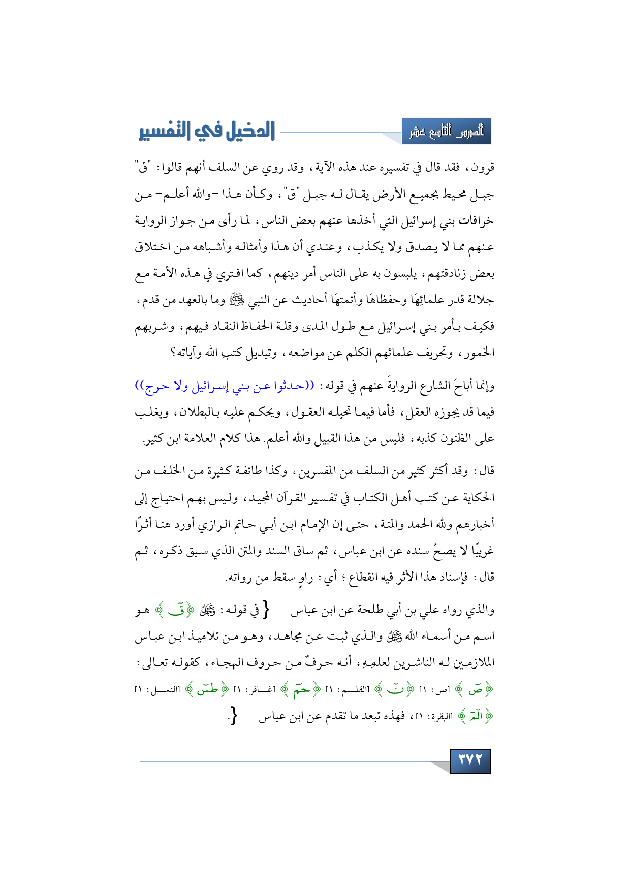 قرون، فقد قال في تفسيره عند هذه الآية، وقد روي عن السلف أنهم قالوا: " ق " جبل محيط بجميع الأرض يقال له جبل "ق"، وكأن هذا -والله أعلم- من خرافات بني إسرائيل التي أخذها عنهم بعض الناس، لما رأى من جواز الرواية عنهم مما لا يصدق ولا يكذب، وعندي أن هذا وأمثاله وأشباهه من اختلاق بعض زنادقتهم، يلبسون به على الناس أمر دينهم، كما افتري في هذه الأمة مع جلالة قدر علمائِهَا وحفظاهَا وأئمتهَا أحاديث عن النبي -صلى الله عليه وسلم- وما بالعهد من قدم، فكيف بأمر بني إسرائيل مع طول المدى وقلة الحفاظ النقاد فيهم، وشربهم الخمور، وتحريف علمائهم الكلم عن مواضعه، وتبديل كتبِ الله وآياته؟