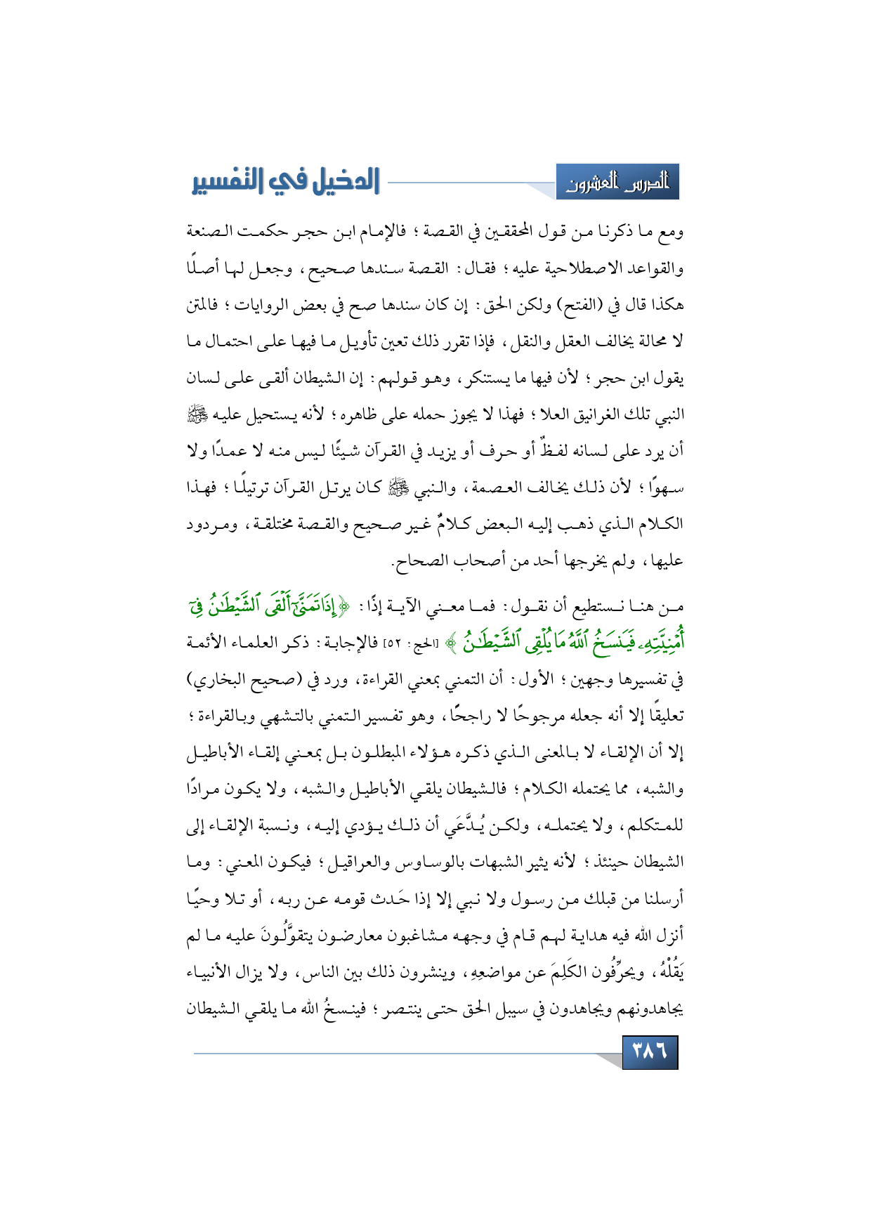 من هنا نستطيع أن نقول: فما معني الآية إذًا: {إِذَا تَمَنَّى أَلْقَى الشَّيْطَانُ فِي أُمْنِيَّتِهِ فَيَنْسَخُ اللَّهُ مَا يُلْقِي الشَّيْطَانُ} (الحج: 52) فالإجابة: ذكر العلماء الأئمة في تفسيرها وجهين؛ الأول: أن التمني بمعني القراءة، ورد في (صحيح البخاري) تعليقًا إلا أنه جعله مرجوحًا لا راجحًًا، وهو تفسير التمني بالتشهي وبالقراءة؛ إلا أن الإلقاء لا بالمعنى الذي ذكره هؤلاء المبطلون بل بمعني إلقاء الأباطيل والشبه، مما يحتمله الكلام؛ فالشيطان يلقي الأباطيل والشبه، ولا يكون مرادا للمتكلم، ولا يحتمله، ولكن يُدَّعَي أن ذلك يؤدي إليه، ونسبة الإلقاء إلى الشيطان حينئذ؛ لأنه يثير الشبهات بالوساوس والعراقيل؛ فيكون المعني: وما أرسلنا من قبلك من رسول ولا نبي إلا إذا حَدث قومه عن ربه، أو تلا وحيًا أنزل الله فيه هداية لهم قام في وجهه مشاغبون معارضون يتقوَّلُونَ عليه ما لم يَقُلْهُ، ويحرِّفُون الكَلِمَ عن مواضعِهِ، وينشرون ذلك بين الناس، ولا يزال الأنبياء يجاهدونهم ويجاهدون في سيبل الحق حتى ينتصر؛ فينسخُ الله ما يلقي الشيطان