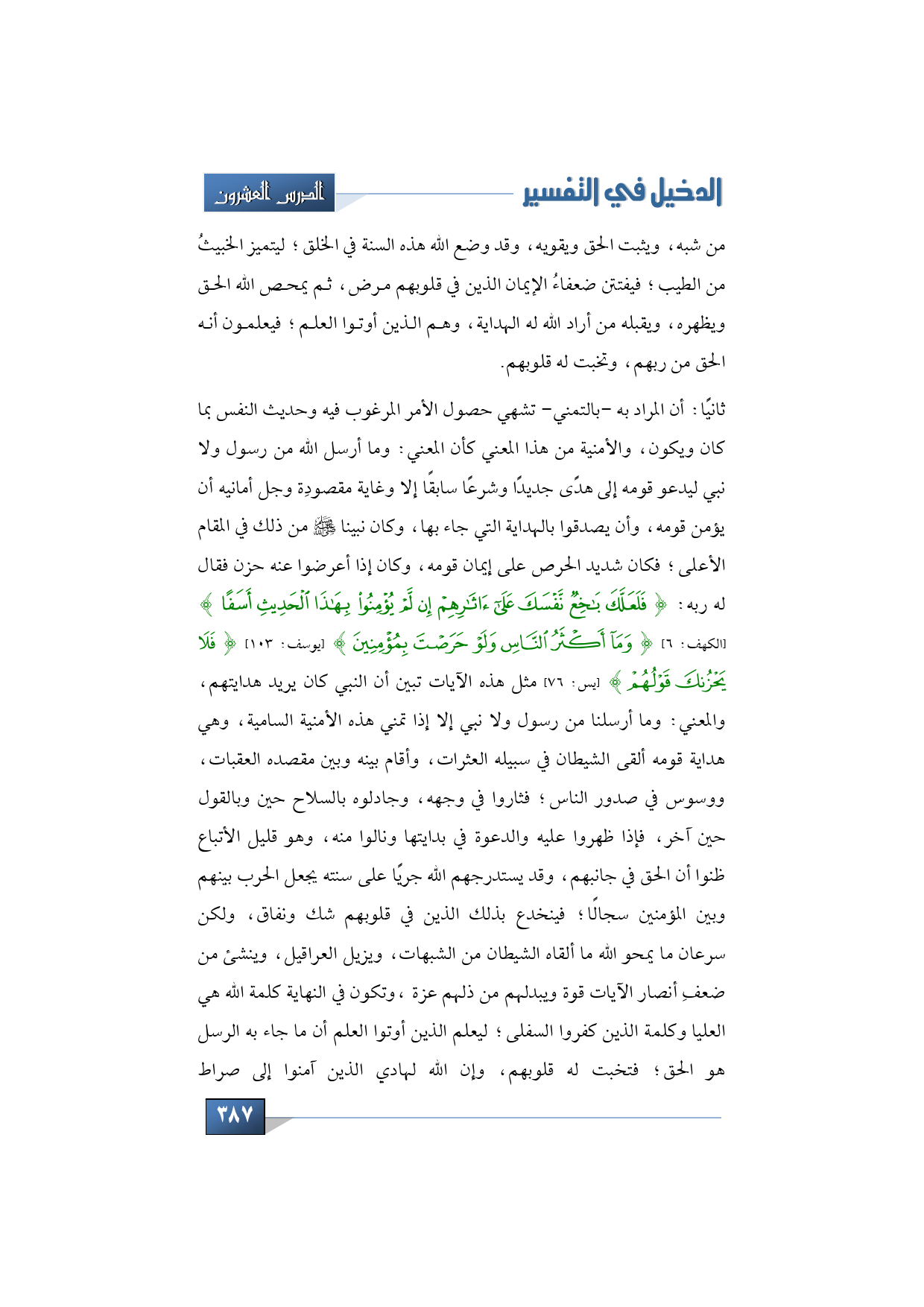 ثانيًا: أن المراد به -بالتمني- تشهي حصول الأمر المرغوب فيه وحديث النفس بما كان ويكون، والأمنية من هذا المعني كأن المعني: وما أرسل الله من رسول ولا نبي ليدعو قومه إلى هدًى جديدًا وشرعًا سابقًا إلا وغاية مقصودِة وجل أمانيه أن يؤمن قومه، وأن يصدقوا بالهداية التي جاء بها، وكان نبينا -صلى الله عليه وسلم- من ذلك في المقام الأعلى؛ فكان شديد الحرص على إيمان قومه، وكان إذا أعرضوا عنه حزن فقال له ربه: {فَلَعَلَّكَ بَاخِعٌ نَفْسَكَ عَلَى آثَارِهِمْ إِنْ لَمْ يُؤْمِنُوا بِهَذَا الْحَدِيثِ أَسَفًا} (الكهف: 6) {وَمَا أَكْثَرُ النَّاسِ وَلَوْ حَرَصْتَ بِمُؤْمِنِينَ} (يوسف: 103) {فَلَا يَحْزُنْكَ قَوْلُهُمْ} (يس: 76) مثل هذه الآيات تبين أن النبي كان يريد هدايتهم، والمعني: وما أرسلنا من رسول ولا نبي إلا إذا تمني هذه الأمنية السامية، وهي هداية قومه ألقى الشيطان في سبيله العثرات، وأقام بينه وبين مقصده العقبات، ووسوس في صدور الناس؛ فثاروا في وجهه، وجادلوه بالسلاح حين وبالقول حين آخر، فإذا ظهروا عليه والدعوة في بدايتها ونالوا منه، وهو قليل الأتباع ظنوا أن الحق في جانبهم، وقد يستدرجهم الله جريًا على سنته يجعل الحرب بينهم وبين المؤمنين سجالا؛ فينخدع بذلك الذين في قلوبهم شك ونفاق، ولكن سرعان ما يمحو الله ما ألقاه الشيطان من الشبهات، ويزيل العراقيل، وينشئ من ضعفِ أنصار الآيات قوة ويبدلهم من ذلهم عزة، وتكون في النهاية كلمة الله هي العليا وكلمة الذين كفروا السفلى؛ ليعلم الذين أوتوا العلم أن ما جاء به الرسل هو الحق؛ فتخبت له قلوبهم، وإن الله لهادي الذين آمنوا إلى صراط