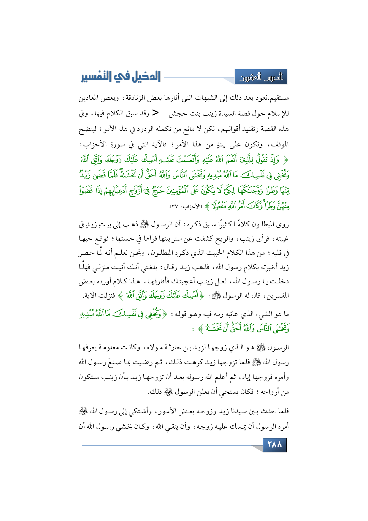 مستقيم. نعود بعد ذلك إلى الشبهات التي أثارها بعض الزنادقة، وبعض المعادين للإسلام حول قصة السيدة زينب بنت حجش -رضي الله عنها- وقد سبق الكلام فيها، وفي هذه القصة وتفنيد أقوالهم، لكن لا مانع من تكمله الردود في هذا الأمر؛ ليتضح الموقف، ونكون على بينةٍ من هذا الأمر؛ فالآية التي في سورة الأحزاب: {وَإِذْ تَقُولُ لِلَّذِي أَنْعَمَ اللَّهُ عَلَيْهِ وَأَنْعَمْتَ عَلَيْهِ أَمْسِكْ عَلَيْكَ زَوْجَكَ وَاتَّقِ اللَّهَ وَتُخْفِي فِي نَفْسِكَ مَا اللَّهُ مُبْدِيهِ وَتَخْشَى النَّاسَ وَاللَّهُ أَحَقُّ أَنْ تَخْشَاهُ فَلَمَّا قَضَى زَيْدٌ مِنْهَا وَطَرًا زَوَّجْنَاكَهَا لِكَيْ لَا يَكُونَ عَلَى الْمُؤْمِنِينَ حَرَجٌ فِي أَزْوَاجِ أَدْعِيَائِهِمْ إِذَا قَضَوْا مِنْهُنَّ وَطَرًا وَكَانَ أَمْرُ اللَّهِ مَفْعُولًا} (الأحزاب: 37).