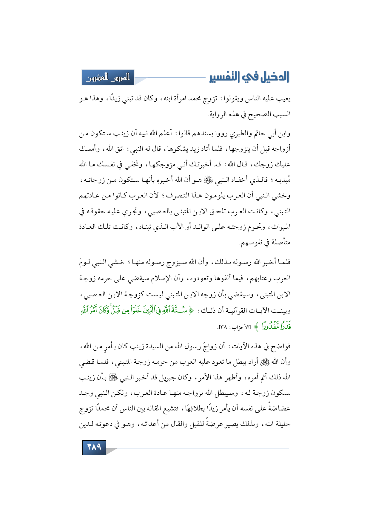 فلما أخبر الله رسوله بذلك، وأن الله سيزوج رسوله منها؛ خشي النبي لومَ العرب وعتابهم، فيما ألفوها وتعودوه، وأن الإسلام سيقضي على حرمه زوجة الابن المتبنى، وسيقضي بأن زوجه الابن المتبني ليست كزوجة الابن العصبي، وبينت الآيات القرآنية أن ذلك: {سُنَّةَ اللَّهِ فِي الَّذِينَ خَلَوْا مِنْ قَبْلُ وَكَانَ أَمْرُ اللَّهِ قَدَرًا مَقْدُورًا} (الأحزاب: 38).