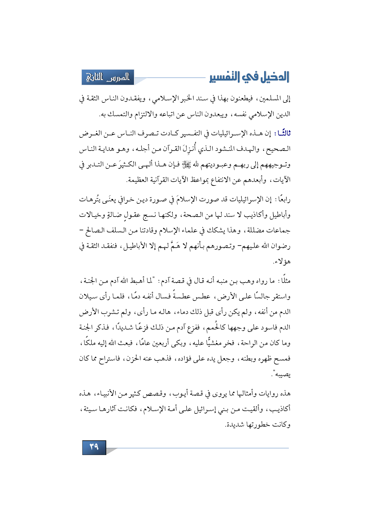 ثالثًا: إن هذه الإسرائيليات في التفسير كادت تصرف الناس عن الغرض الصحيح، والهدف المنشود الذي أُنزِلَ القرآن من أجله، وهو هداية الناس وتوجيههم إلى ربهم وعبوديتهم لله -سبحانه وتعالى- فإن هذا ألهى الكثيرَ عن التدبر في الآيات، وأبعدهم عن الانتفاع بمواعظ الآيات القرآنية العظيمة.