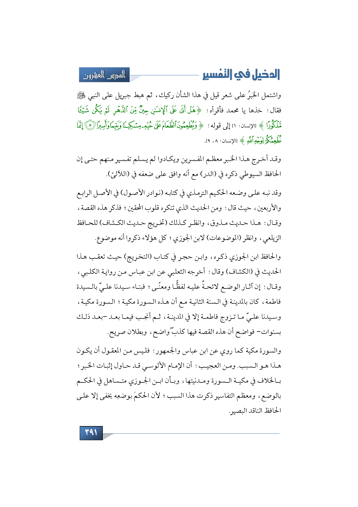 والحافظ ابن الجوزي ذكره، وابن حجر في كتاب (التخريج) حيث تعقب هذا الحديث في (الكشاف) وقال: أخرجه الثعلبي عن ابن عباس من رواية الكلبي، وقال: إن آثار الوضع لائحةٌ عليه لفظًًا ومعنى؛ فبناء سيدنا عليٌ بالسيدة فاطمة، كان بالمدينة في السنة الثانية مع أن هذه السورة مكية؛ السورة مكية، وسيدنا عليٌ ما تزوج فاطمة إلا في المدينة، ثم أنجب فيما بعد -بعد ذلك بسنوات- فواضح أن هذه القصة فيها كذبً ُواضح، وبطلان صريح.