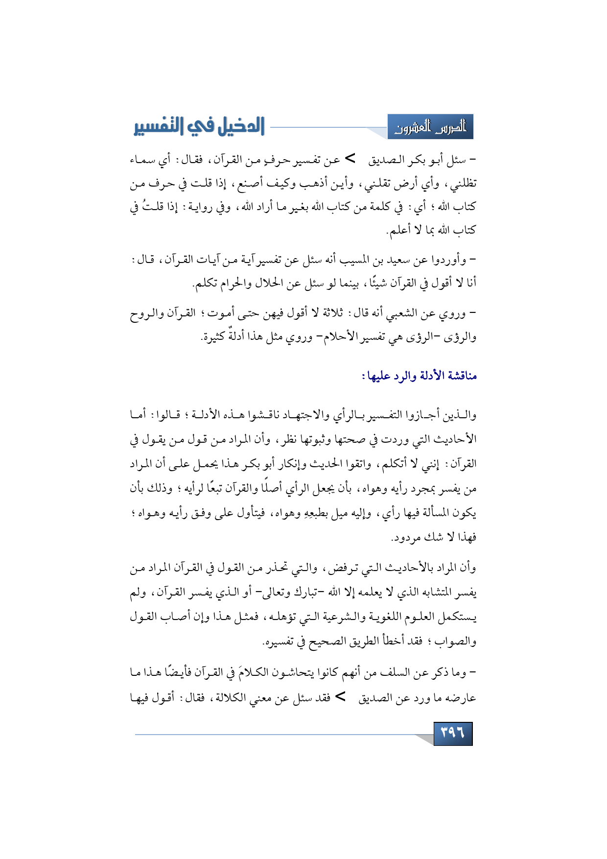 وما ذكر عن السلف من أنهم كانوا يتحاشون الكلامَ في القرآن فأيضًا هذا ما عارضه ما ورد عن الصديق -رضي الله عنه- فقد سئل عن معني الكلالة، فقال: أقول فيها