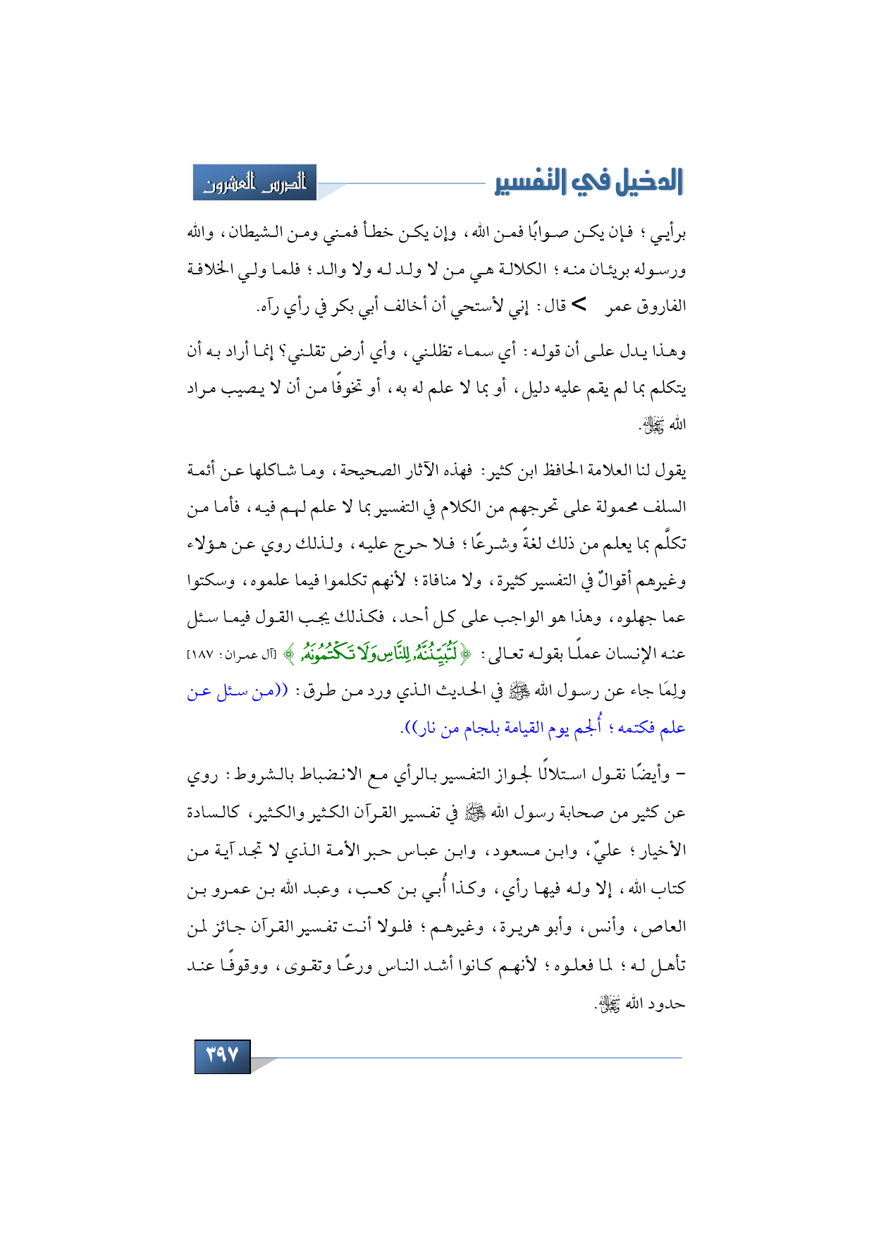 يقول لنا العلامة الحافظ ابن كثير: فهذه الآثار الصحيحة، وما شاكلها عن أئمة السلف محمولة على تحرجهم من الكلام في التفسير بما لا علم لهم فيه، فأما من تكلَّم بما يعلم من ذلك لغةً وشرعًا؛ فلا حرج عليه، ولذلك روي عن هؤلاء وغيرهم أقوالٌ في التفسير كثيرة، ولا منافاة؛ لأنهم تكلموا فيما علموه، وسكتوا عما جهلوه، وهذا هو الواجب على كل أحد، فكذلك يجب القول فيما سئل عنه الإنسان عملًا بقوله تعالى: {لَتُبَيِّنُنَّهُ لِلنَّاسِ وَلَا تَكْتُمُونَهُ} (آل عمران: 187) ولِمَا جاء عن رسول الله -صلى الله عليه وسلم- في الحديث الذي ورد من طرق: ((من سئل عن علم فكتمه؛ أُلجم يوم القيامة بلجام من نار)).