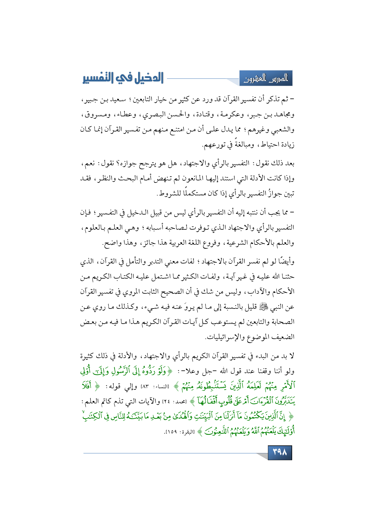 وبعد ذلك نستطيع أن نقول: لا بد من البدء في تفسير القرآن الكريم بالرأي والاجتهاد، والأدلة في ذلك كثيرة ولو أننا وقفنا عند قول الله -جل وعلا-: {وَلَوْ رَدُّوهُ إِلَى الرَّسُولِ وَإِلَى أُولِي الْأَمْرِ مِنْهُمْ لَعَلِمَهُ الَّذِينَ يَسْتَنْبِطُونَهُ مِنْهُمْ} (النساء: 83) وإلي قوله: {أَفَلَا يَتَدَبَّرُونَ الْقُرْآنَ أَمْ عَلَى قُلُوبٍ أَقْفَالُهَا} (محمد: 24) والآيات التي تذم كاتم العلم: {إِنَّ الَّذِينَ يَكْتُمُونَ مَا أَنْزَلْنَا مِنَ الْبَيِّنَاتِ وَالْهُدَى مِنْ بَعْدِ مَا بَيَّنَّاهُ لِلنَّاسِ فِي الْكِتَابِ أُولَئِكَ يَلْعَنُهُمُ اللَّهُ وَيَلْعَنُهُمُ اللَّاعِنُونَ} (البقرة: 159).