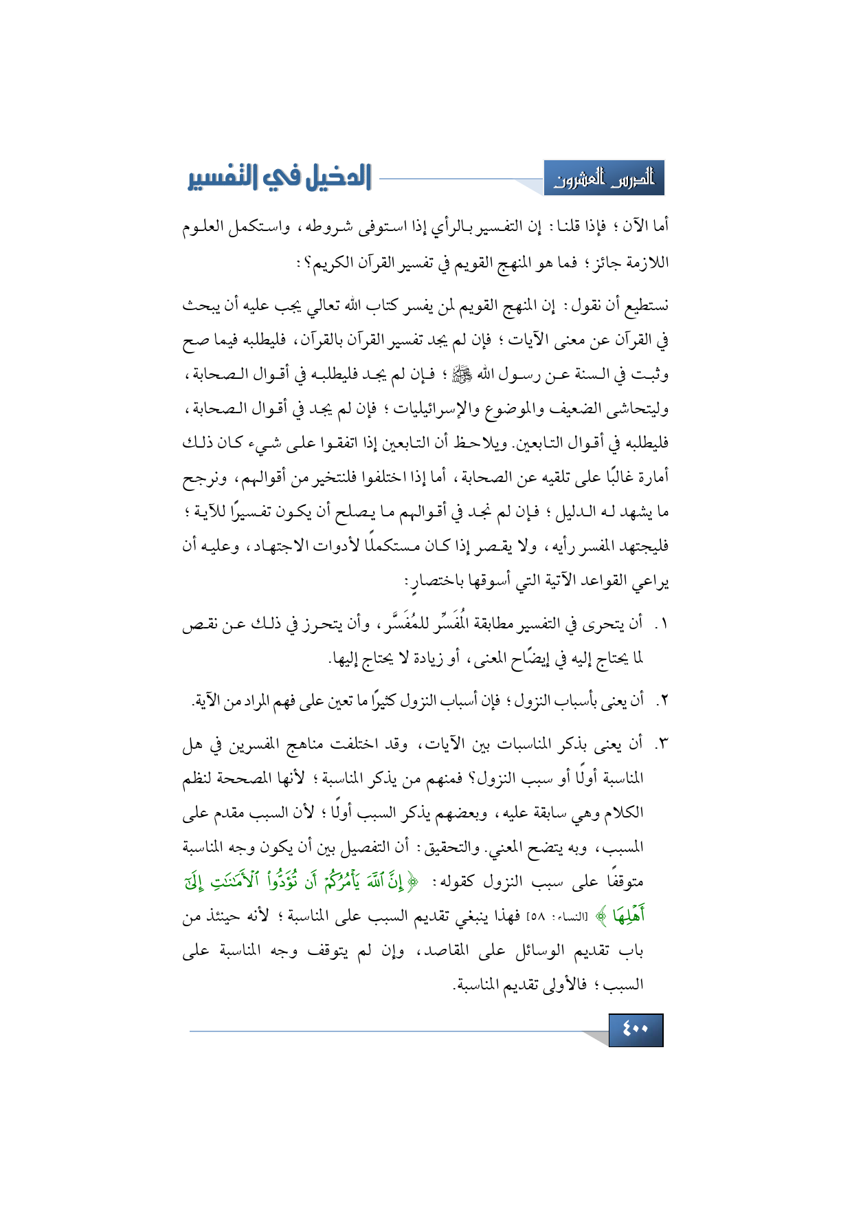 3 - أن يعنى بذكر المناسبات بين الآيات، وقد اختلفت مناهج المفسرين في هل المناسبة أولًا أو سبب النزول؟ فمنهم من يذكر المناسبة؛ لأنها المصححة لنظم الكلام وهي سابقة عليه، وبعضهم يذكر السبب أولًا؛ لأن السبب مقدم على المسبب، وبه يتضح المعني. والتحقيق: أن التفصيل بين أن يكون وجه المناسبة متوقفًا على سبب النزول كقوله: {إِنَّ اللَّهَ يَأْمُرُكُمْ أَنْ تُؤَدُّوا الْأَمَانَاتِ إِلَى أَهْلِهَا} (النساء: 58) فهذا ينبغي تقديم السبب على المناسبة؛ لأنه حينئذ من باب تقديم الوسائل على المقاصد، وإن لم يتوقف وجه المناسبة على السبب؛ فالأولى تقديم المناسبة.
