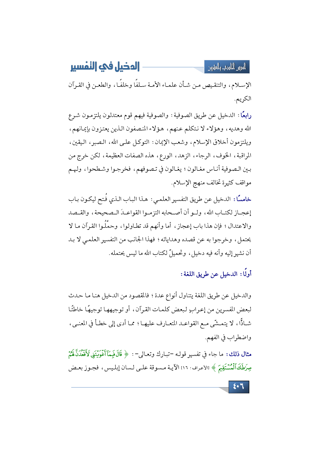 خامسًا: الدخيل عن طريق التفسير العلمي: هذا الباب الذي فُتح ليكون باب إعجاز لكتاب الله، ولو أن أصحابه التزموا القواعدَ الصحيحة، والقصد والاعتدال؛ فإن هذا باب إعجاز، أما وأنهم قد تطاولوا، وحمَّلُوا القرآن ما لا يحتمل، وخرجوا به عن قصده وهداياته؛ فهذا الجانب من التفسير العلمي لا بد أن نشير إليه وأنه فيه دخيل، وتحميلٌ لكتاب الله ما ليس يحتمله.