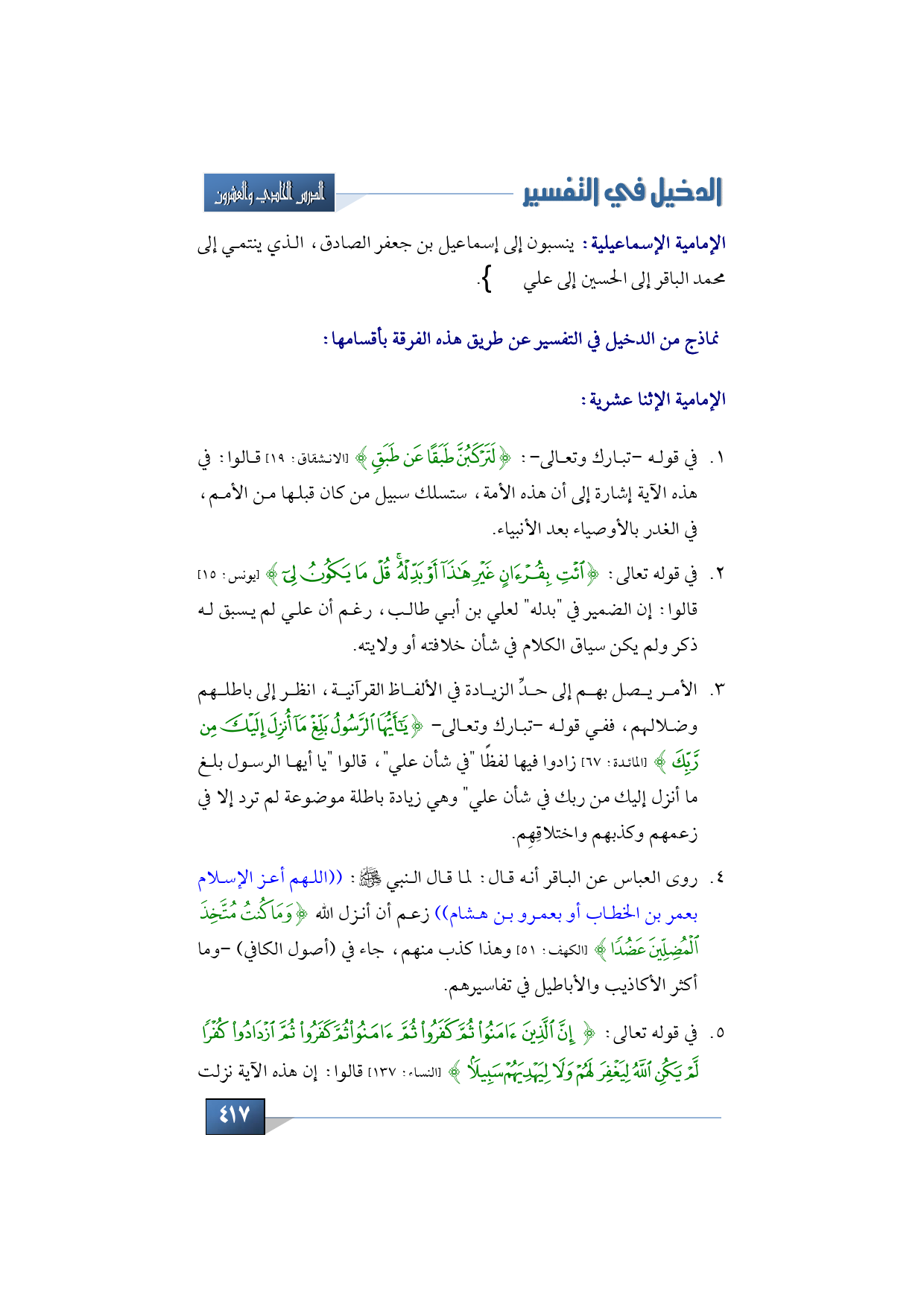 رابعًا: روى العباس عن الباقر أنه قال: لما قال النبي -صلى الله عليه وسلم-: ((اللهم أعز الإسلام بعمر بن الخطاب أو بعمرو بن هشام)) زعم أن أنزل الله {وَمَا كُنْتُ مُتَّخِذَ الْمُضِلِّينَ عَضُدًا} (الكهف: 51) وهذا كذب منهم، جاء في (أصول الكافي) -وما أكثر الأكاذيب والأباطيل في تفاسيرهم- في قوله تعالى: {إِنَّ الَّذِينَ آمَنُوا ثُمَّ كَفَرُوا ثُمَّ آمَنُوا ثُمَّ كَفَرُوا ثُمَّ ازْدَادُوا كُفْرًا لَمْ يَكُنِ اللَّهُ لِيَغْفِرَ لَهُمْ وَلَا لِيَهْدِيَهُمْ سَبِيلًا} (النساء: 137) قالوا: إن هذه الآية نزلت
