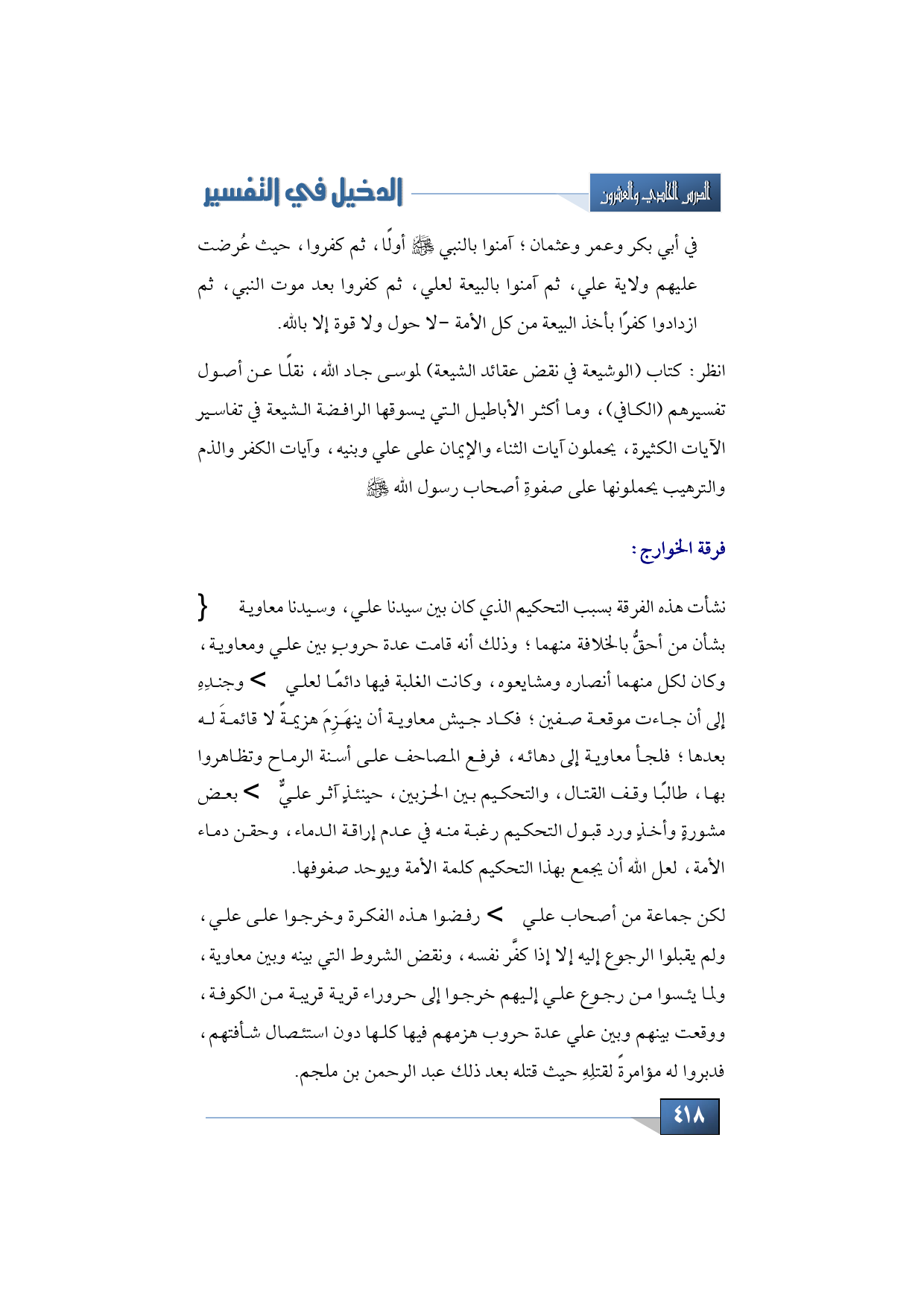 انظر: كتاب (الوشيعة في نقض عقائد الشيعة) لموسى جاد الله، نقلًا عن أصول تفسيرهم (الكافي)، وما أكثر الأباطيل التي يسوقها الرافضة الشيعة في تفاسير الآيات الكثيرة، يحملون آيات الثناء والإيمان على علي وبنيه، وآيات الكفر والذم والترهيب يحملونها على صفوةِ أصحاب رسول الله -صلى الله عليه وسلم-.