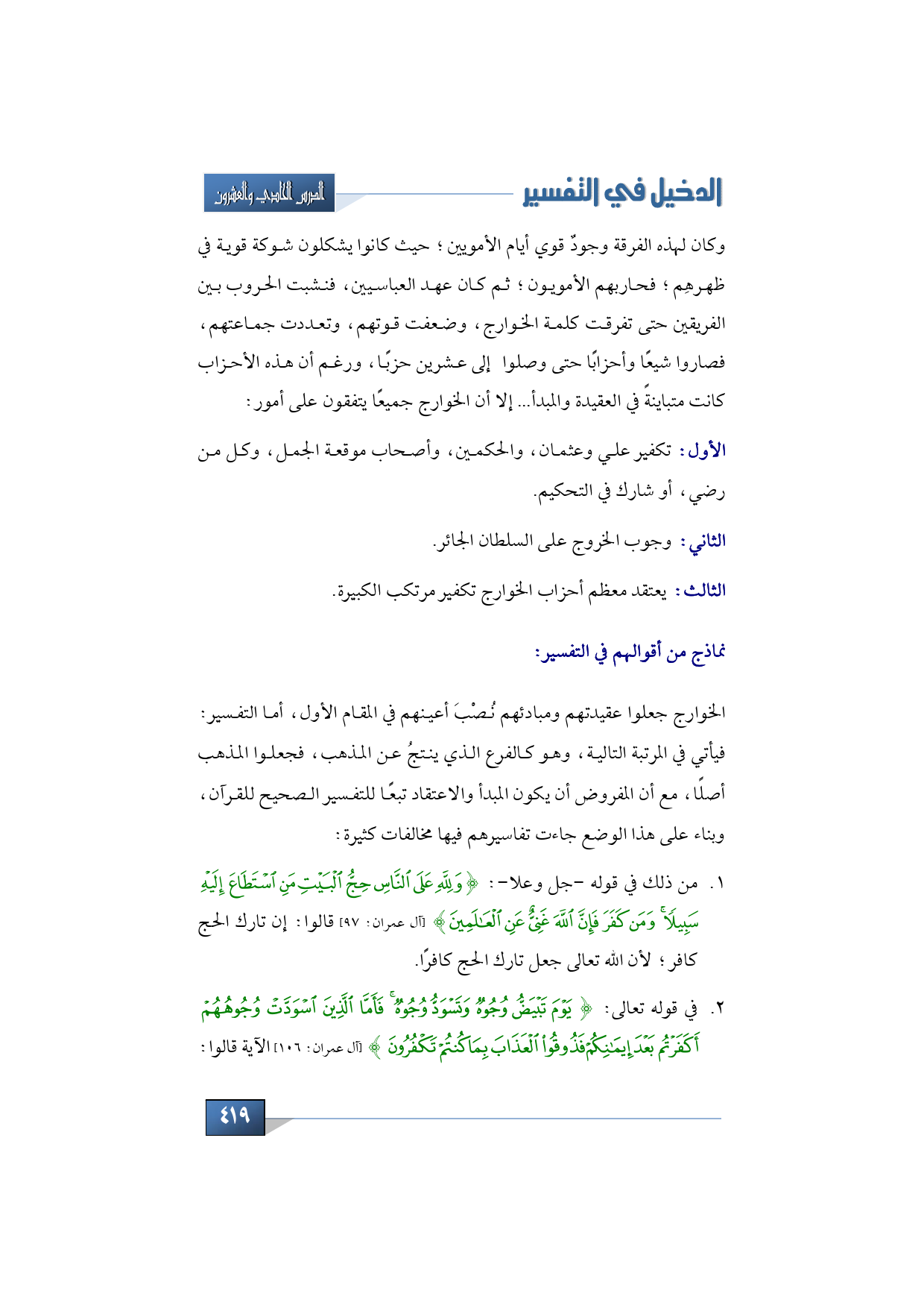 الخوارج جعلوا عقيدتهم ومبادئهم نُصْبَ أعينهم في المقام الأول، أما التفسير: فيأتي في المرتبة التالية، وهو كالفرع الذي ينتجُ عن المذهب، فجعلوا المذهب أصلًا، مع أن المفروض أن يكون المبدأ والاعتقاد تبعًا للتفسير الصحيح للقرآن، وبناء على هذا الوضع جاءت تفاسيرهم فيها مخالفات كثيرة، من ذلك في قوله -جل وعلا-: {وَلِلَّهِ عَلَى النَّاسِ حِجُّ الْبَيْتِ مَنِ اسْتَطَاعَ إِلَيْهِ سَبِيلًا وَمَنْ كَفَرَ فَإِنَّ اللَّهَ غَنِيٌّ عَنِ الْعَالَمِينَ} (آل عمران: 97) قالوا: إن تارك الحج كافر؛ لأن الله تعالى جعل تارك الحج كافرًا.