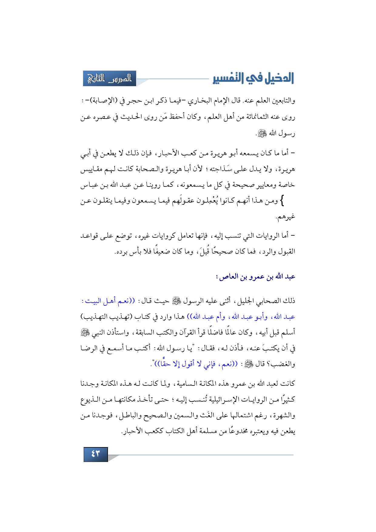 عبد الله بن عمرو بن العاص: ذلك الصحابي الجليل، أثنى عليه الرسول -صلى الله عليه وسلم- حيث قال: ((نعم أهل البيت: عبد الله، وأبو عبد الله، وأم عبد الله)) هذا وارد في كتاب (تهذيب التهذيب) أسلم قبل أبيه، وكان عالمًا فاضلًا قرأ القرآن والكتب السابقة، واستأذن النبي -صلى الله عليه وسلم- في أن يكتبَ عنه، فأذن له، فقال: "يا رسول الله: أكتب ما أسمع في الرضا والغضب؟ قال -عليه الصلاة والسلام-: ((نعم، فإني لا أقول إلا حقًّا)) ".