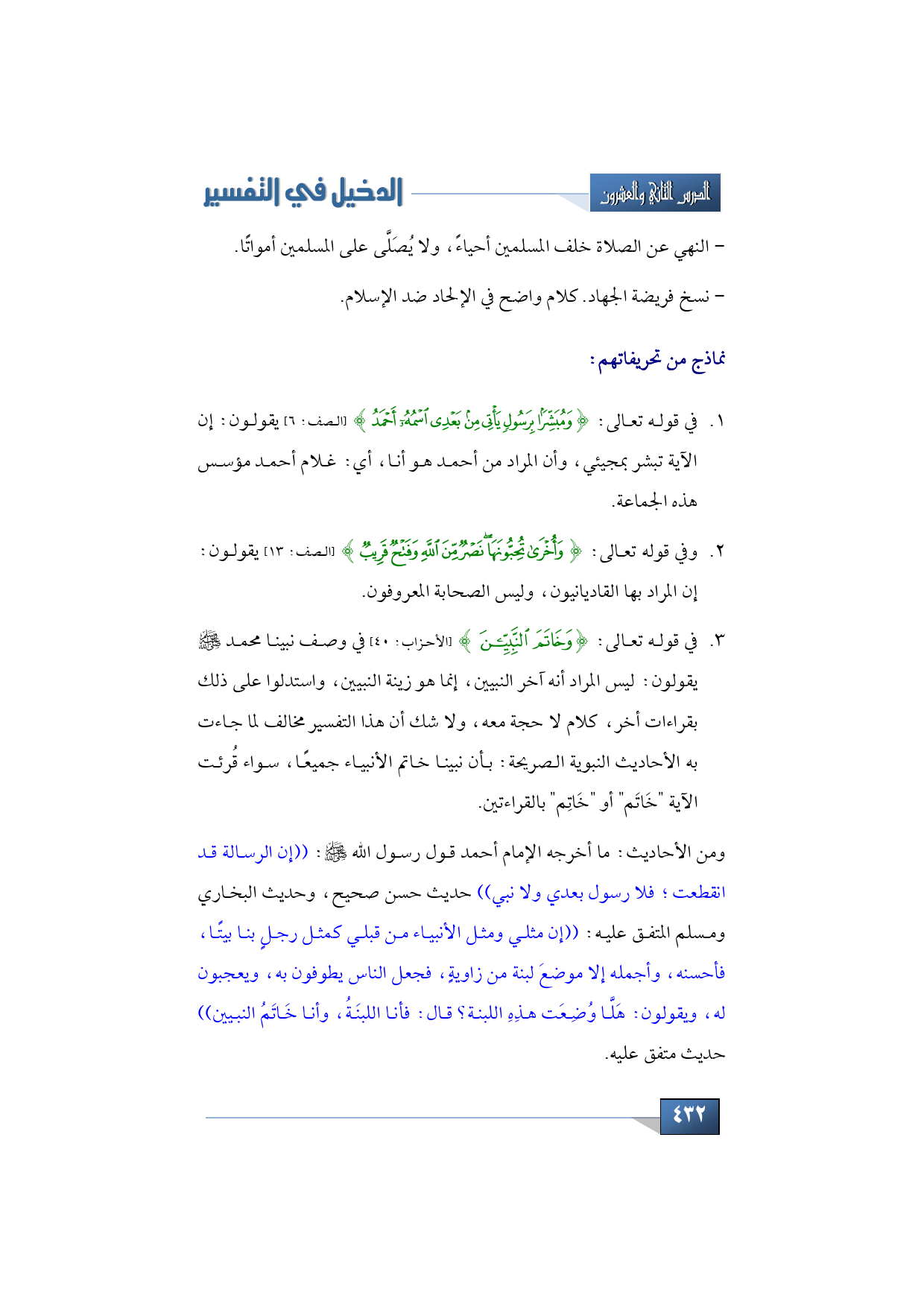 وفي قوله تعالى: {وَأُخْرَى تُحِبُّونَهَا نَصْرٌ مِنَ اللَّهِ وَفَتْحٌ قَرِيبٌ} (الصف: 13) يقولون: إن المراد بها القاديانيون، وليس الصحابة المعروفون، في قوله تعالى: {وخَاتَمَ النَّبِيِّينَ} (الأحزاب: 40) في وصف نبينا محمد -عليه الصلاة والسلام- يقولون: ليس المراد أنه آخر النبيين، إنما هو زينة النبيين، واستدلوا على ذلك بقراءات أخر، كلام لا حجة معه، ولا شك أن هذا التفسير مخالف لما جاءت به الأحاديث النبوية الصريحة: بأن نبينا خاتم الأنبياء جميعًا، سواء قُرئت الآية "خَاتَم" أو "خَاتِم" بالقراءتين.