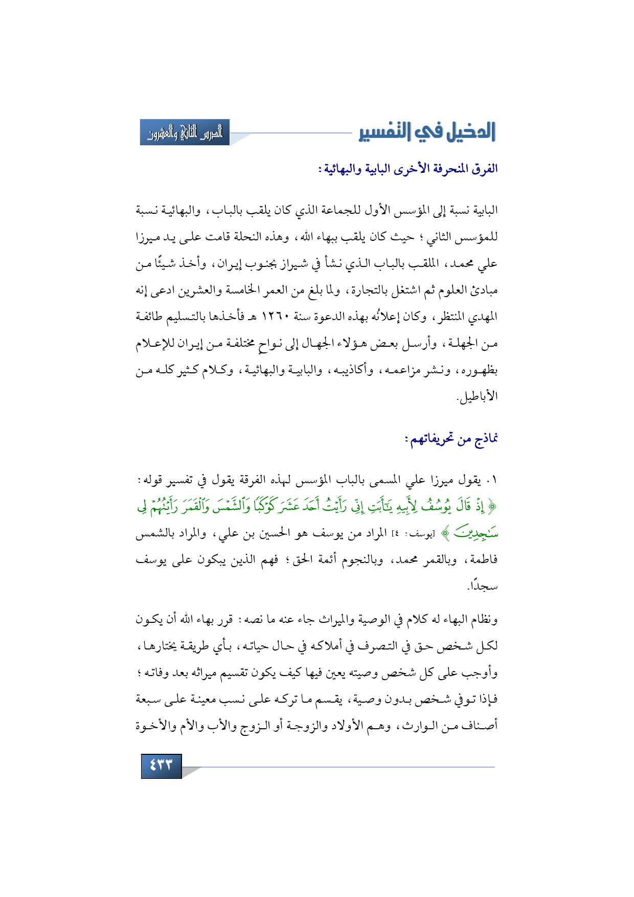 لننتقل إلى نماذج من تفاسيرهم: يقول ميرزا علي المسمى بالباب المؤسس لهذه الفرقة يقول في تفسير قوله: {إِذْ قَالَ يُوسُفُ لِأَبِيهِ يَا أَبَتِ إِنِّي رَأَيْتُ أَحَدَ عَشَرَ كَوْكَبًا وَالشَّمْسَ وَالْقَمَرَ رَأَيْتُهُمْ لِي سَاجِدِينَ} (يوسف: 4) المراد من يوسف هو الحسين بن علي، والمراد بالشمس فاطمة، وبالقمر محمد، وبالنجوم أئمة الحق؛ فهم الذين يبكون على يوسف سجدًا.