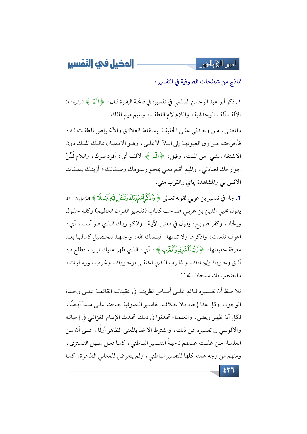 وإلى نماذج عابرة سريعة من شطحات الصوفية في التفسير، ذكر أبو عبد الرحمن السلمي في تفسيره في فاتحة البقرة قال: {الم} (البقرة: 1) الألف ألف الوحدانية، واللام لام اللطف، والميم ميم الملك.