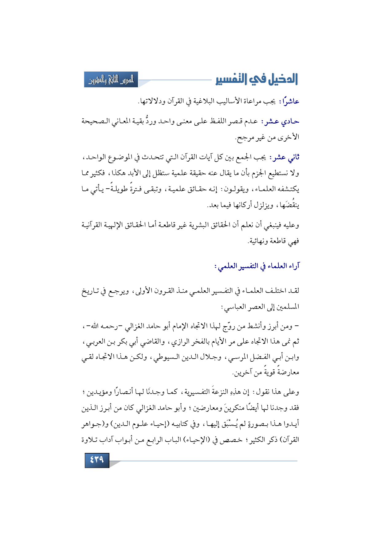 وعلى هذا، فإننا نقول: إن هذِهِ النزعةَ التفسيرية، كما وجدنَا لها أنصارًا ومؤيدين؛ فقد وجدنا لها أيضًا منكرينَ ومعارضين؛ فمن أبرز الزعماء لكل فريق؟ أبو حامد الغزالي، كان من أبرز الذين أيدوا هذا بصورةٍ لم يُسْبَق إليها، وفي كتابيه (إحياء علوم الدين) و (جواهر القرآن) ذكر الكثير؛ خصص في (الإحياء) الباب الرابع من أبواب آداب تلاوة