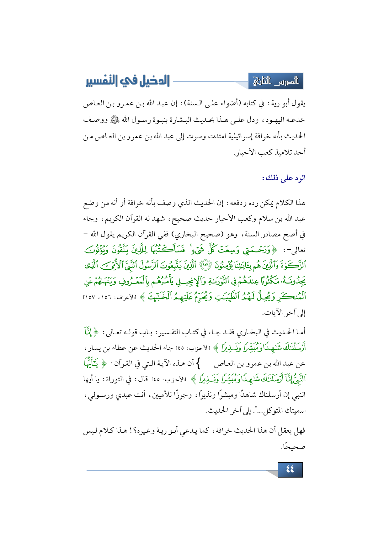 هذا الكلام يمكن رده ودفعه: إن الحديث الذي وصف بأنه خرافة أو أنه من وضع عبد الله بن سلام وكعب الأحبار حديث صحيح، شهد له القرآن الكريم، وجاء في أصح مصادر السنة، وهو (صحيح البخاري) ففي القرآن الكريم يقول الله -تعالى-: {وَرَحْمَتِي وَسِعَتْ كُلَّ شَيْءٍ فَسَأَكْتُبُهَا لِلَّذِينَ يَتَّقُونَ وَيُؤْتُونَ الزَّكَاةَ وَالَّذِينَ هُمْ بِآيَاتِنَا يُؤْمِنُونَ * الَّذِينَ يَتَّبِعُونَ الرَّسُولَ النَّبِيَّ الْأُمِّيَّ الَّذِي يَجِدُونَهُ مَكْتُوبًا عِنْدَهُمْ فِي التَّوْرَاةِ وَالْإِنْجِيلِ يَأْمُرُهُمْ بِالْمَعْرُوفِ وَيَنْهَاهُمْ عَنِ الْمُنْكَرِ وَيُحِلُّ لَهُمُ الطَّيِّبَاتِ وَيُحَرِّمُ عَلَيْهِمُ الْخَبَائِثََ} (الأعراف: 156، 157) إلى آخر الآيات.