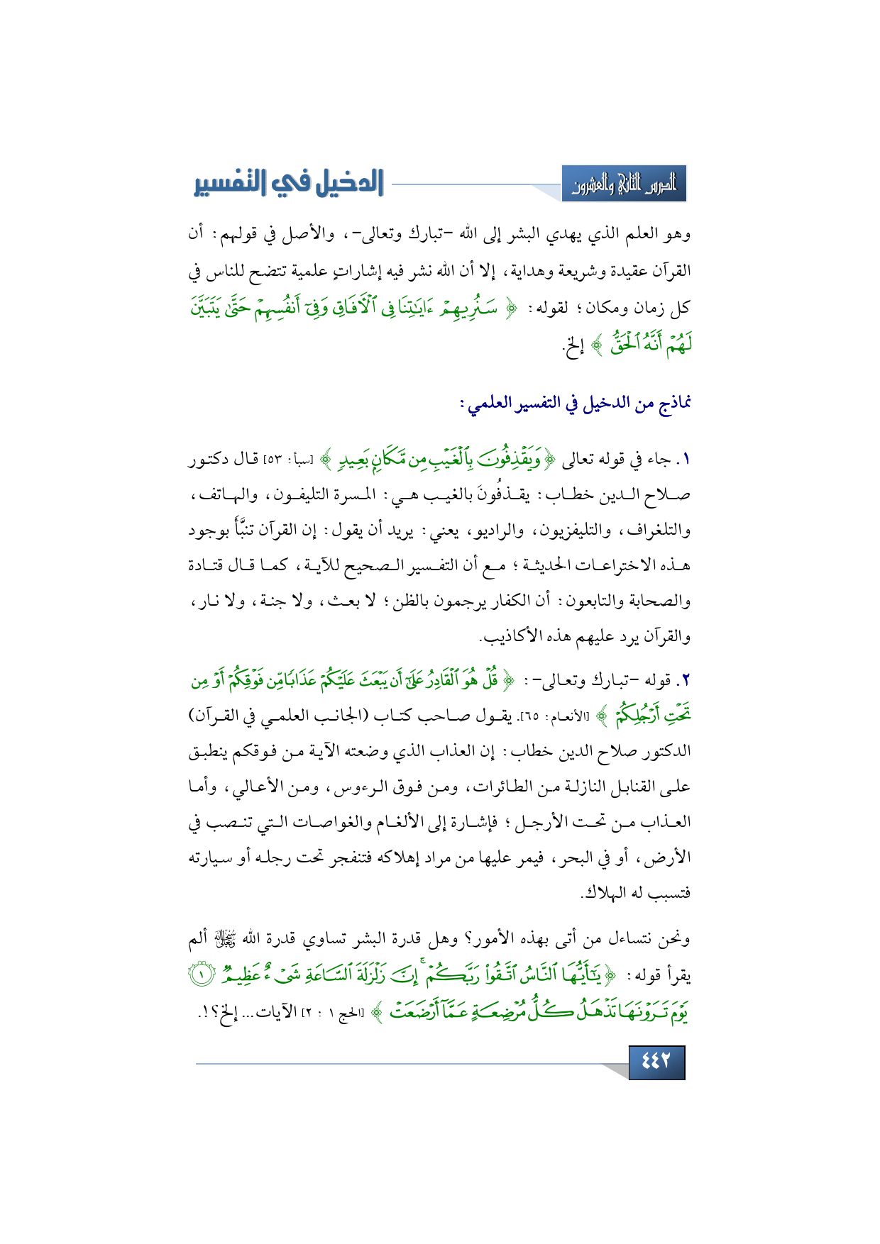 وهو العلم الذي يهدي البشر إلى الله -تبارك وتعالى-، والأصل في قولهم: أن القرآن عقيدة وشريعة وهداية، إلا أن الله نشر فيه إشاراتٍ علمية تتضح للناس في كل زمان ومكان؛ لقوله: {سَنُرِيهِمْ آيَاتِنَا فِي الْآفَاقِ وَفِي أَنْفُسِهِمْ حَتَّى يَتَبَيَّنَ لَهُمْ أَنَّهُ الْحَقُّ} إلى آخره.
