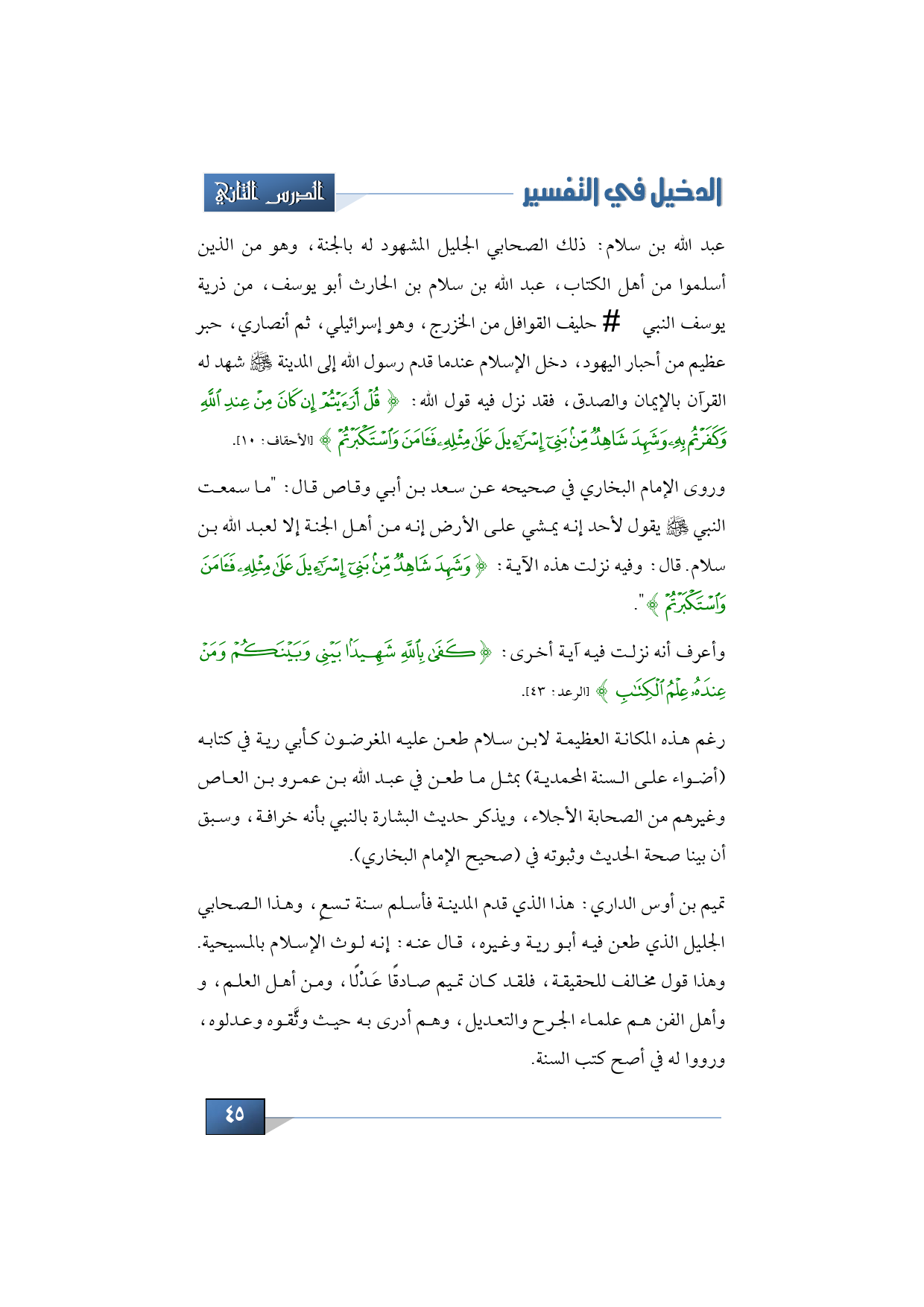 عبد الله بن سلام: ذلك الصحابي الجليل المشهود له بالجنة، وهو من الذين أسلموا من أهل الكتاب، عبد الله بن سلام بن الحارث أبو يوسف، من ذرية يوسف النبي -عليه السلام- حليف القوافل من الخزرج، وهو إسرائيلي، ثم أنصاري، حبر عظيم من أحبار اليهود، دخل الإسلام عندما قدم رسول الله إلى المدينة -صلوات الله وسلامه عليه- شهد له القرآن بالإيمان والصدق، فقد نزل فيه قول الله: {قُلْ أَرَأَيْتُمْ إِنْ كَانَ مِنْ عِنْدِ اللَّهِ وَكَفَرْتُمْ بِهِ وَشَهِدَ شَاهِدٌ مِنْ بَنِي إِسْرَائِيلَ عَلَى مِثْلِهِ فَآمَنَ وَاسْتَكْبَرْتُمْ} (الأحقاف: 10).