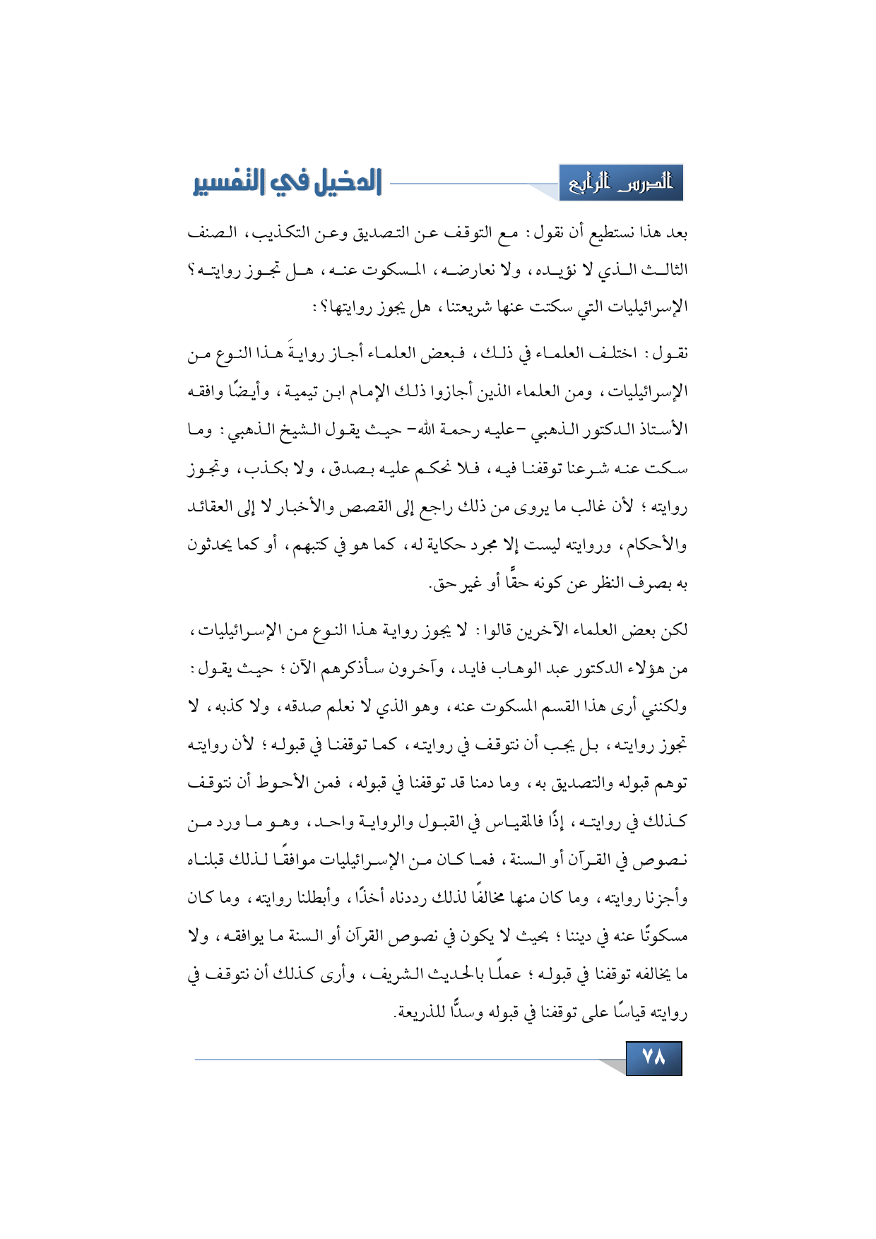 لكن بعض العلماء الآخرين قالوا: لا يجوز رواية هذا النوع من الإسرائيليات، من هؤلاء الدكتور عبد الوهاب فايد، وآخرون سأذكرهم الآن؛ حيث يقول: ولكنني أرى هذا القسم المسكوت عنه، وهو الذي لا نعلم صدقه، ولا كذبه، لا تجوز روايته، بل يجب أن نتوقف في روايته، كما توقفنا في قبوله؛ لأن روايته توهم قبوله والتصديق به، وما دمنا قد توقفنا في قبوله، فمن الأحوط أن نتوقف كذلك في روايته، إذًا فالمقياس في القبول والرواية واحد، وهو ما ورد من نصوص في القرآن أو السنة، فما كان من الإسرائيليات موافقًا لذلك قبلناه وأجزنا روايته، وما كان منها مخالفًا لذلك رددناه أخذًا، وأبطلنا روايته، وما كان مسكوتًا عنه في ديننا؛ بحيث لا يكون في نصوص القرآن أو السنة ما يوافقه، ولا ما يخالفه توقفنا في قبوله؛ عملًا بالحديث الشريف، وأرى كذلك أن نتوقف في روايته قياسًا على توقفنا في قبوله وسدًّا للذريعة.
