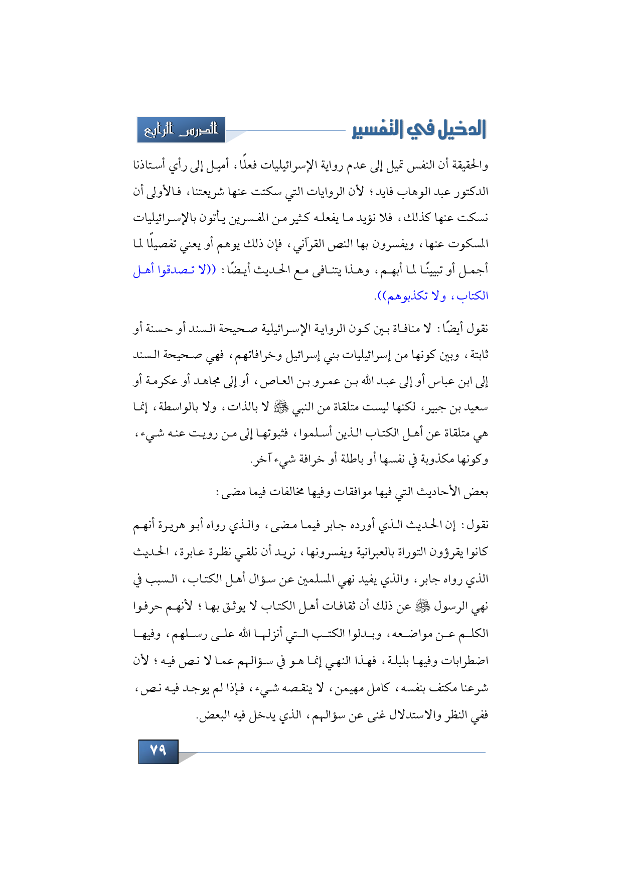 نقول: إن الحديث الذي أورده جابر فيما مضى، والذي رواه أبو هريرة أنهم كانوا يقرؤون التوراة بالعبرانية ويفسرونها، نريد أن نلقي نظرة عابرة، الحديث الذي رواه جابر، والذي يفيد نهي المسلمين عن سؤال أهل الكتاب، السبب في نهي الرسول -صلى الله عليه وسلم- عن ذلك أن ثقافات أهل الكتاب لا يوثق بها؛ لأنهم حرفوا الكلم عن مواضعه، وبدلوا الكتب التي أنزلها الله على رسلهم، وفيها اضطرابات وفيها بلبلة، فهذا النهي إنما هو في سؤالهم عما لا نص فيه؛ لأن شرعنا مكتف بنفسه، كامل مهيمن، لا ينقصه شيء، فإذا لم يوجد فيه نص، ففي النظر والاستدلال غنى عن سؤالهم، الذي يدخل فيه البعض.