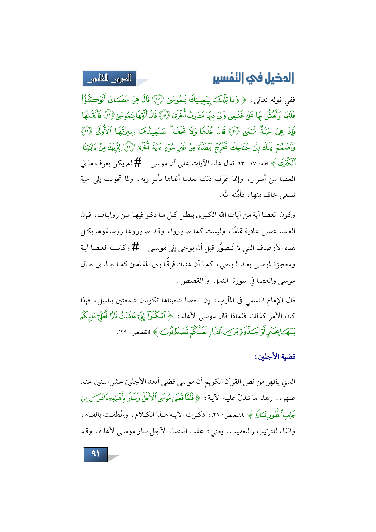 ففي قوله تعالى: {وَمَا تِلْكَ بِيَمِينِكَ يَا مُوسَى * قَالَ هِيَ عَصَايَ أَتَوَكَّأُ عَلَيْهَا وَأَهُشُّ بِهَا عَلَى غَنَمِي وَلِيَ فِيهَا مَآرِبُ أُخْرَى * قَالَ أَلْقِهَا يَا مُوسَى * فَأَلْقَاهَا فَإِذَا هِيَ حَيَّةٌ تَسْعَى * قَالَ خُذْهَا وَلَا تَخَفْ سَنُعِيدُهَا سِيرَتَهَا الْأُولَى * وَاضْمُمْ يَدَكَ إِلَى جَنَاحِكَ تَخْرُجْ بَيْضَاءَ مِنْ غَيْرِ سُوءٍ آيَةً أُخْرَى * لِنُرِيَكَ مِنْ آيَاتِنَا الْكُبْرَى} (طه: 17 - 23) تدل هذه الآيات على أن موسى -عليه السلام- لم يكن يعرف ما في العصا من أسرار، وإنما عَرَف ذلك بعدما ألقاها بأمر ربه، ولما تحولت إلى حية تسعى خاف منها، فأم َّ نه الله.