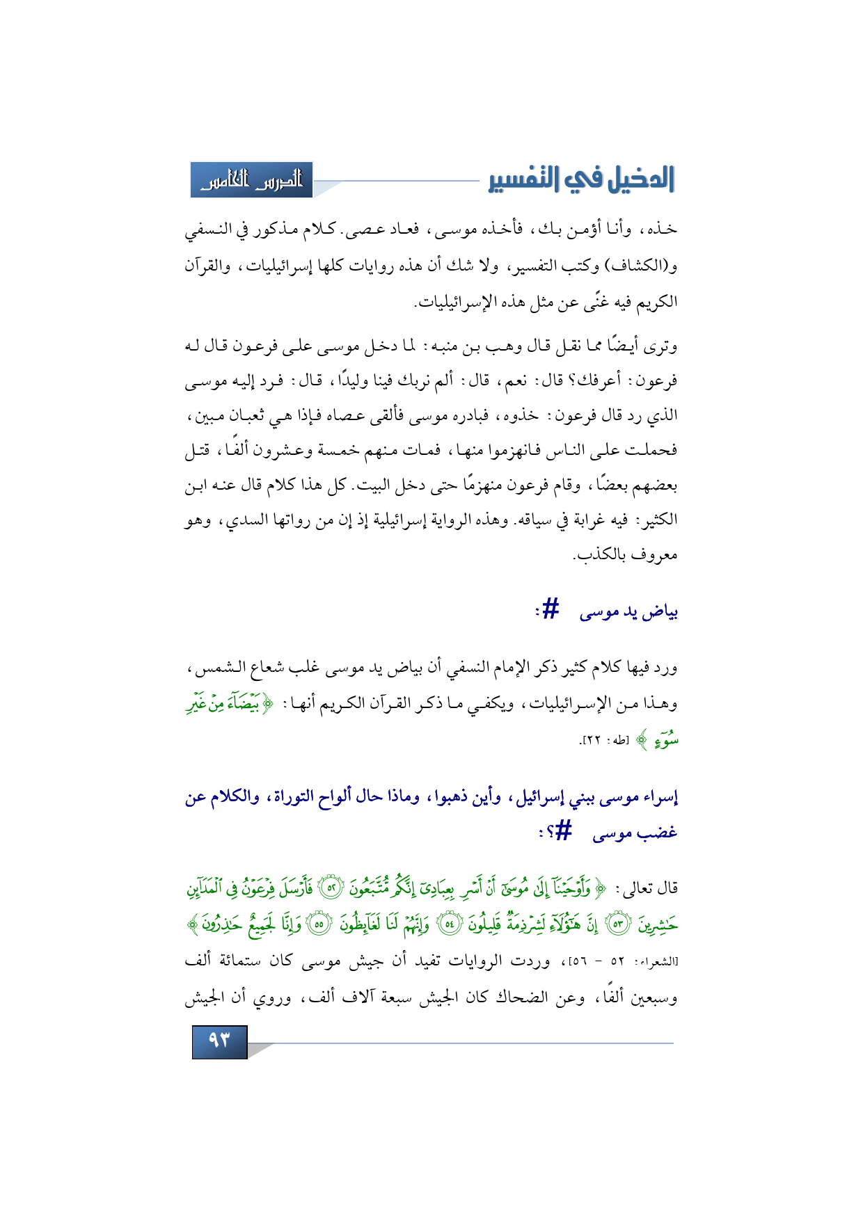 وترى أيضًا مما نقل قال وهب بن منبه: لما دخل موسى على فرعون قال له فرعون: أعرفك؟ قال: نعم، قال: ألم نربك فينا وليدًا، قال: فرد إليه موسى الذي رد قال فرعون: خذوه، فبادره موسى فألقى عصاه فإذا هي ثعبان مبين، فحملت على الناس فانهزموا منها، فمات منهم خمسة وعشرون ألفًا، قتل بعضهم بعض ً ا، وقام فرعون منهزمًا حتى دخل البيت. كل هذا كلام قال عنه ابن الكثير: فيه غرابة في سياقه. وهذه الرواية إسرائيلية إذ إن من رواتها السدي، وهو معروف بالكذب.