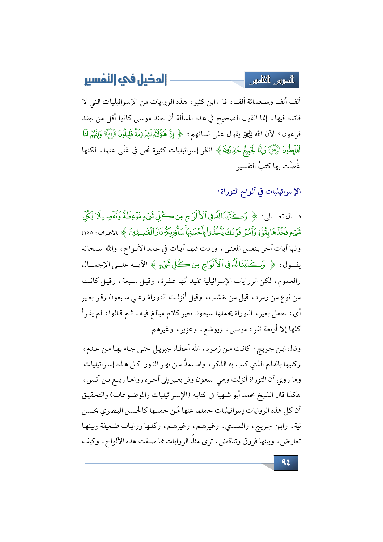 وقال ابن جريج: كانت من زمرد، الله أعطاه جبريل حتى جاء بها من عدم، وكتبها بالقلم الذي كتب به الذكر، واستمد َّ من نهر النور. كل هذه إسرائيليات. وما روي أن التوراة أنزلت وهي سبعون وقر بعير إلى آخره رواها ربيع بن أنس، هكذا قال الشيخ محمد أبو شهبة في كتابه (الإسرائيليات والموضوعات) والتحقيق أن كل هذه الروايات إسرائيليات حملها عنها مَن حملها كالحسن البصري بحسن نية، وابن جريج، والسدي، وغيرهم، وغيرهم، وكلها روايات ضعيفة وبينها تعارض، وبينها فروق وتناقض، ترى مثلًا الروايات مما صنفت هذه الألواح، وكيف